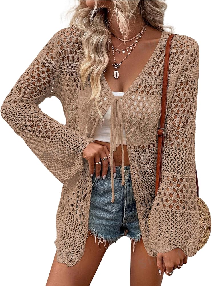 Kimono Cardigan: This boho kimono cover up has a unique crochet knit design, an open front with an adjustable tie, a batwing long sleeve, breathable mesh hollow, drop shoulder, and ribbed hem. Easily create an exceptional vintage and causal look
