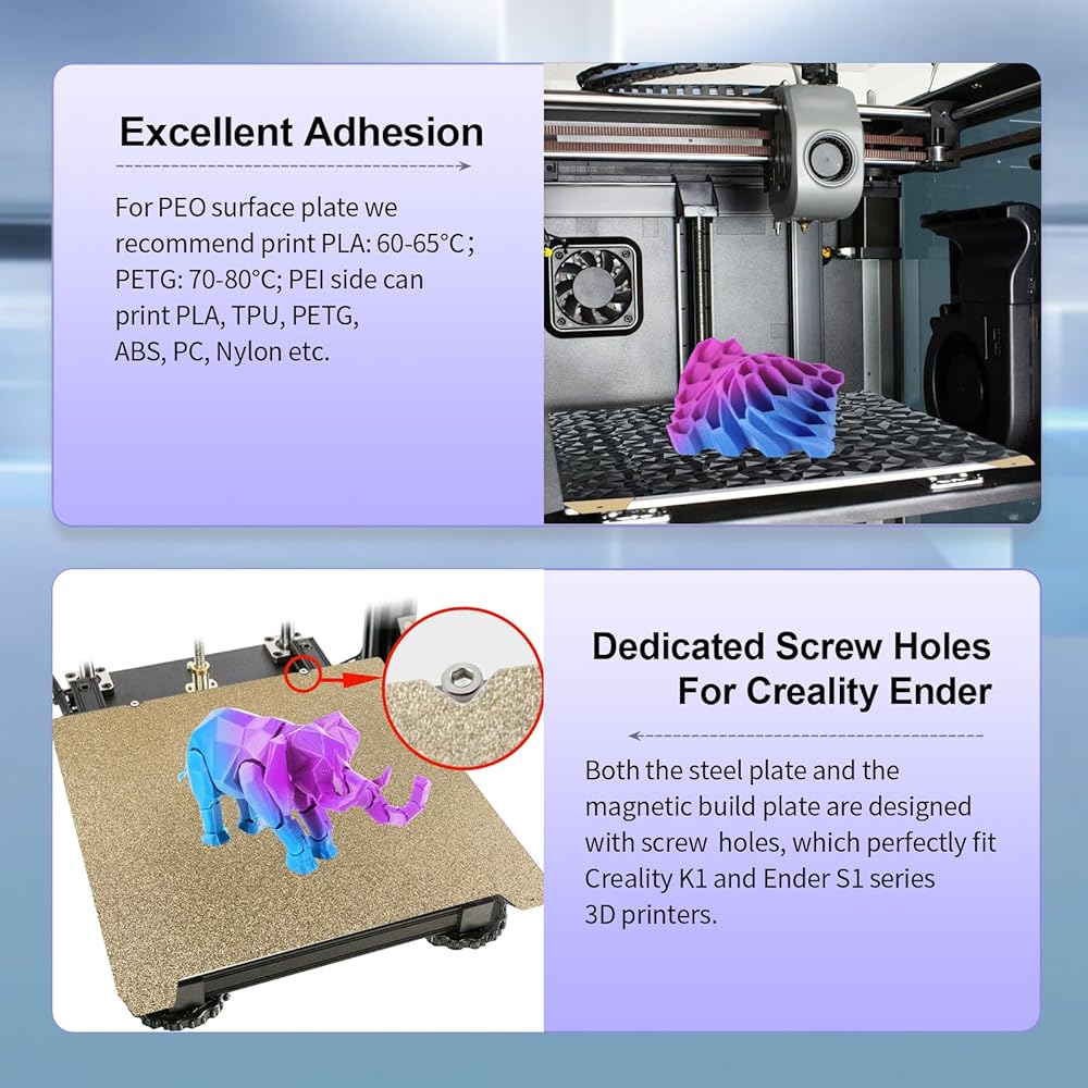 【Compatible 3D Printers】The double sided textured PEO PEI build plate size is 235x235 with screw holes which perfect fit for Creality K1/for Creality K1 SE/for Creality K1C/Ender 3/Ender 3 V2/ Ender 3 Pro/ Ender 5/ Ender 5 Pro/Ender 3 Neo/Ender 3 V2 Neo/Ender 3 S1/Ender 3 S1 Pro/Ender 5 S1/Ender 3 V3 SE/Ender 3 V3 KE.