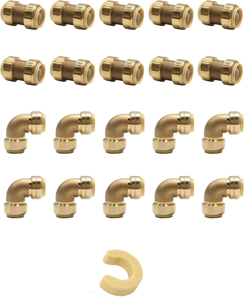 - Includes Certified Lead Free Brass Push Fit Fitting Combo of Tee (2), Elbow (4), Coupling (4) with a Disconnect Clip