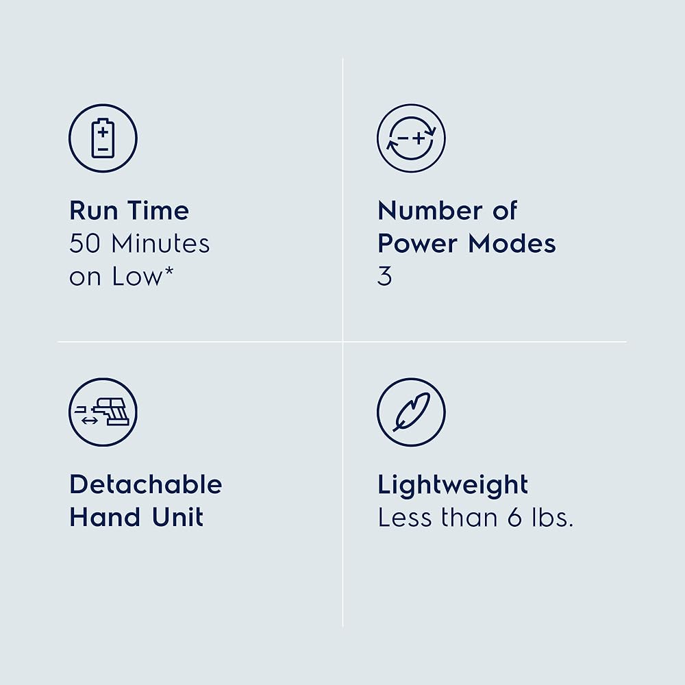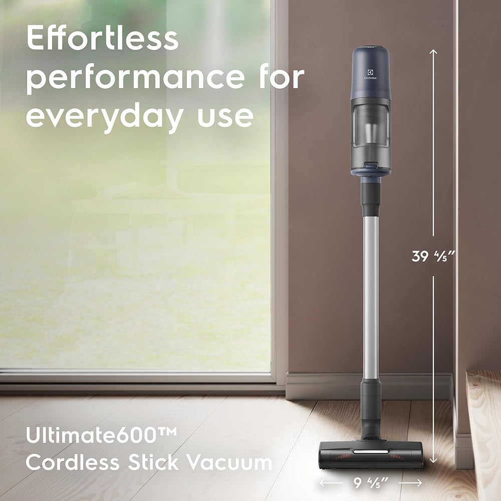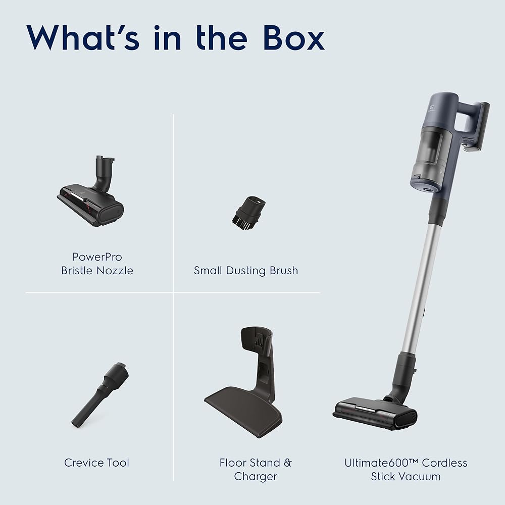 The Electrolux Ultimate600 cordless vacuum features a lightweight design (under 5 lbs. in-hand) and is powerful enough to easily clean a variety of surfaces throughout your home. The PowerPro Bristle Nozzle with LED Lights helps to highlight dirt and dust across your homes surfaces and easily reach under narrow, hard to reach spaces thanks to the vacuum's full tilt design. 50 minutes of run time for cleaning