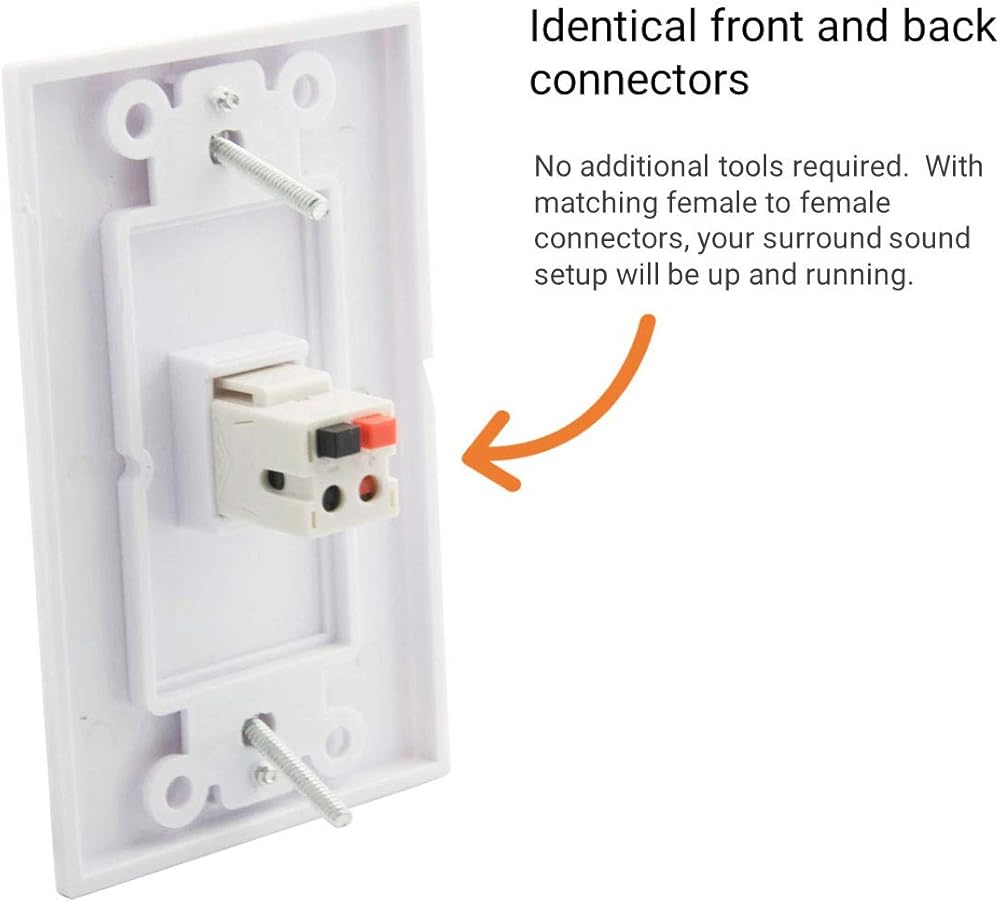 EASY INSTALLATION: Each speaker wire keystone port has matching female to female spring loaded speaker terminal connections. It's as simple as push n' play. No tools or additional hardware needed to install your surround sound speaker wires into the speaker ports.