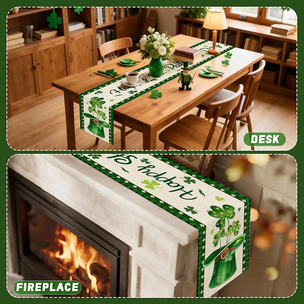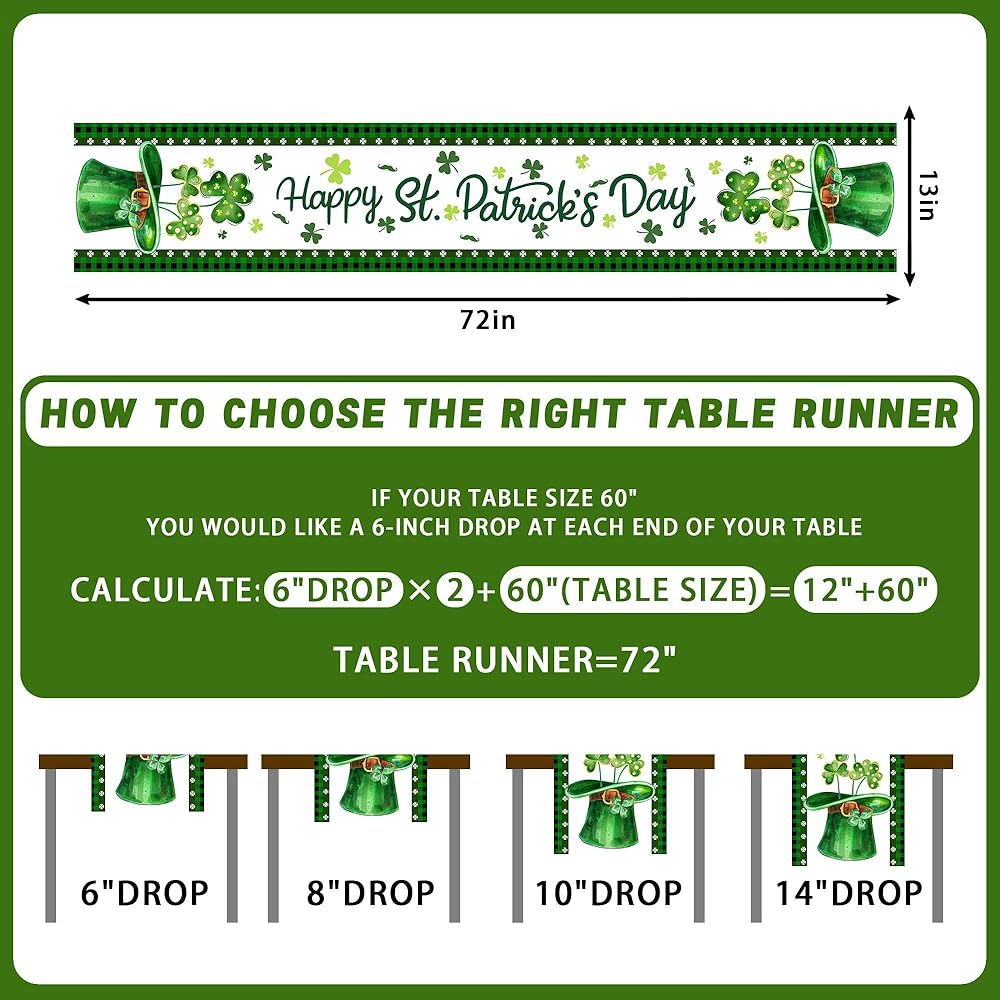 Size & Materials - Measures Approximately 13" X 72" (33*183cm), Suitable for Tables of 4 to 6 People. The Table Runner St Patricks Is Made of Linen, Comfortable, Durable, And Reusable Materials Can Serve You for a Long Time.