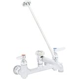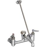 8" wall mount mixing faucet with rough chrome plated brass body, rough chrome plated brass spout with vacuum breaker, pail hook and garden hose male outlet, compression cartridges with spring checks, lever handles, 1/2" NPT female inlets, built-in service stops in body and upper support rod. Certified to ASME A112.18.1/CSA B125.1 NSF 61-Section 9, NSF 372 and ASSE 1001. Meets ADA ANSI/ICC A117.1 requirements.