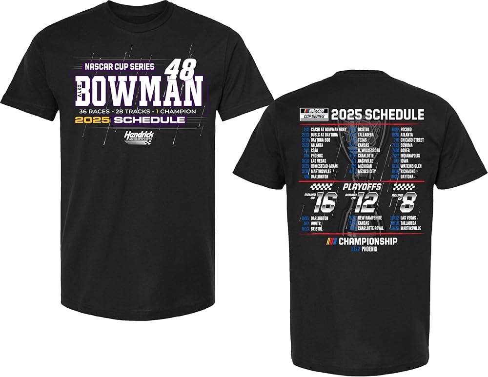 This Chase Elliott t-shirt features front and back screen printed graphics of his name, car number, NASCAR logo and the 2025 NASCAR Cup Series schedule. Officially licensed and made of 100% cotton for comfort and fit.