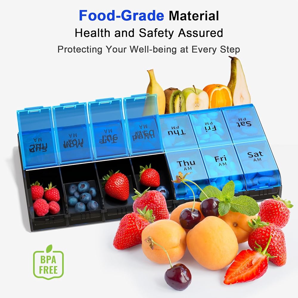 Your Health, Our Priority: Our 7 day pill organizer is crafted from BPA-free food-grade material, is designed to safeguard your supplements and medications. More than just a container, it's your daily companion in maintaining a healthy lifestyle
