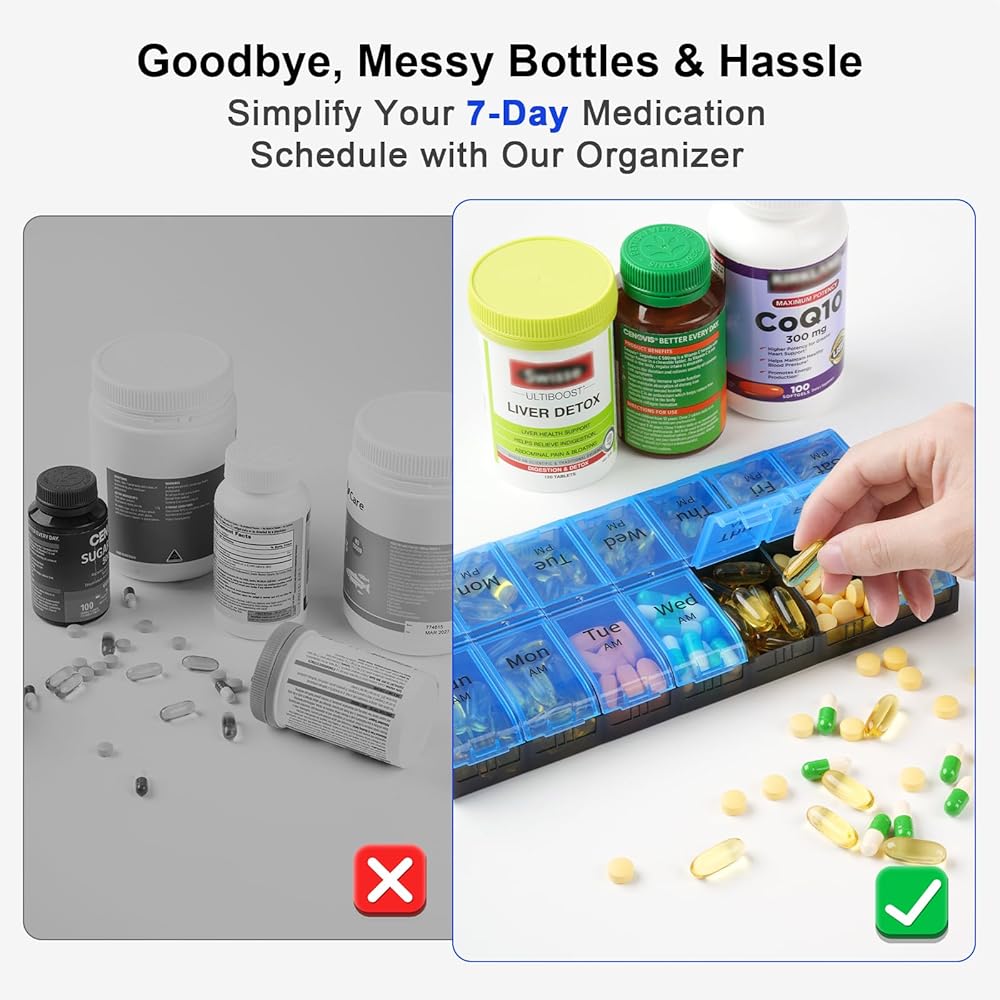 Effortless Medication Management: Fed up with managing multiple bottles and forgetting doses? Our pill organizer 2 times a day is designed to streamline your health routine, helping you keep track easily and never miss an AM or PM dose