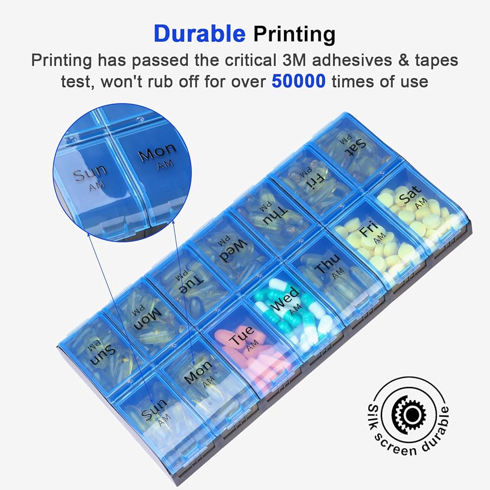 Durable Printing: Our extra large pill case's printing has passed the critical 3M adhesives & tapes test, won't rub off for over 50000 times of use. With clear labeling for each day of the week and AM/PM distinction, you'll easy keep your medication schedule on track