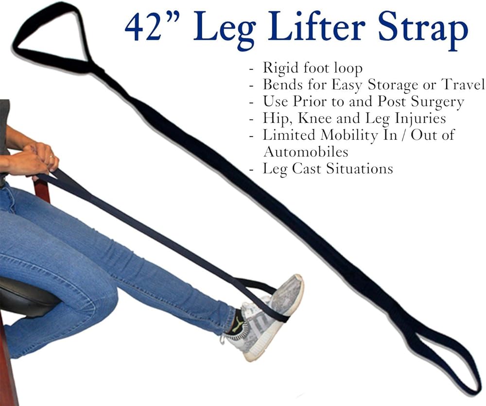 42" LEG LIFTER STRAP: The Loop Leg Lifter, rigid and durable, is designed for repositioning the leg in a car, wheelchair or on a bed after hip replacement surgery, knee or back surgery, or leg injury. The lifter strap is strong enough to handle leg casts with ease.