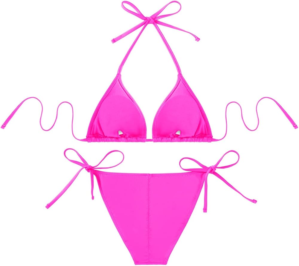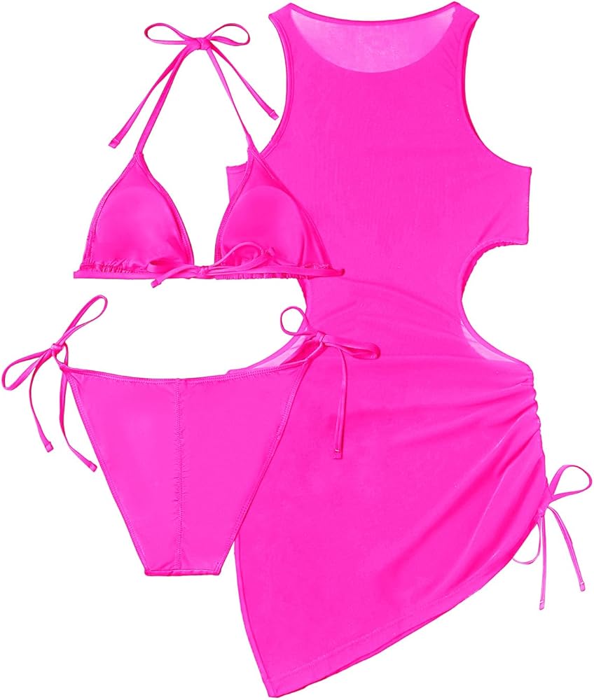 - 3 Piece Swimsuits Set: Includes a mesh cutout cover-up dress, a sexy triangle bra bikini top, and tie-side thong bottoms.