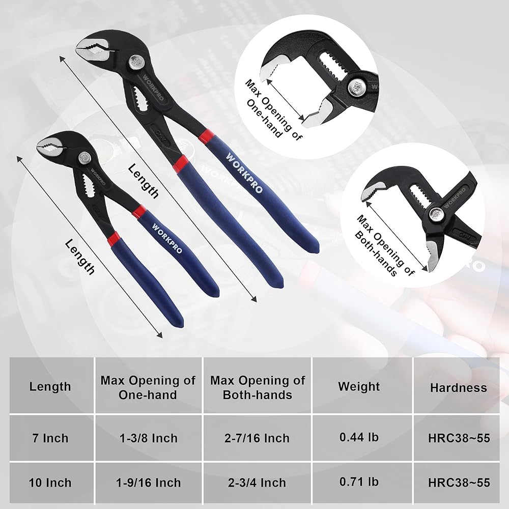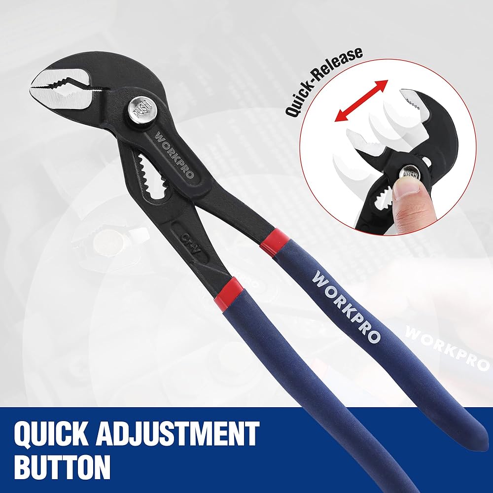 Longer Life: WORKPRO tongue and groove joint pliers are made from premium chrome vanadium steel for high strength and durability. The polished jaw and black phosphating enhance corrosion resistance, making them ideal for plumbers and DIY homeowners