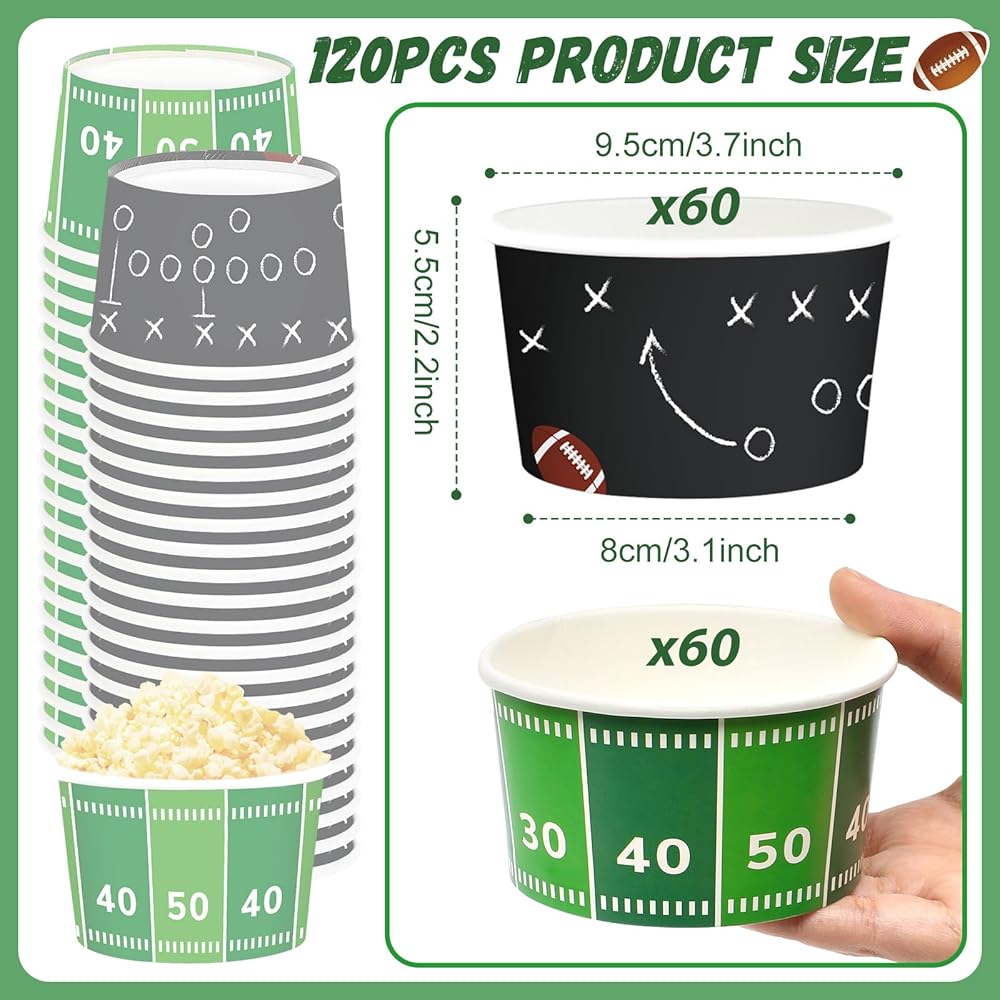 Qyeahkj 120Pcs Football Birthday Snack Bowls Disposable Paper Ice Cream Soup Chili Bowl 8oz Football Snack Dessert Treat Bowl Cup for Sport Game Day Household Party Supplies Decor BBQ Picnic(3 Styles)
