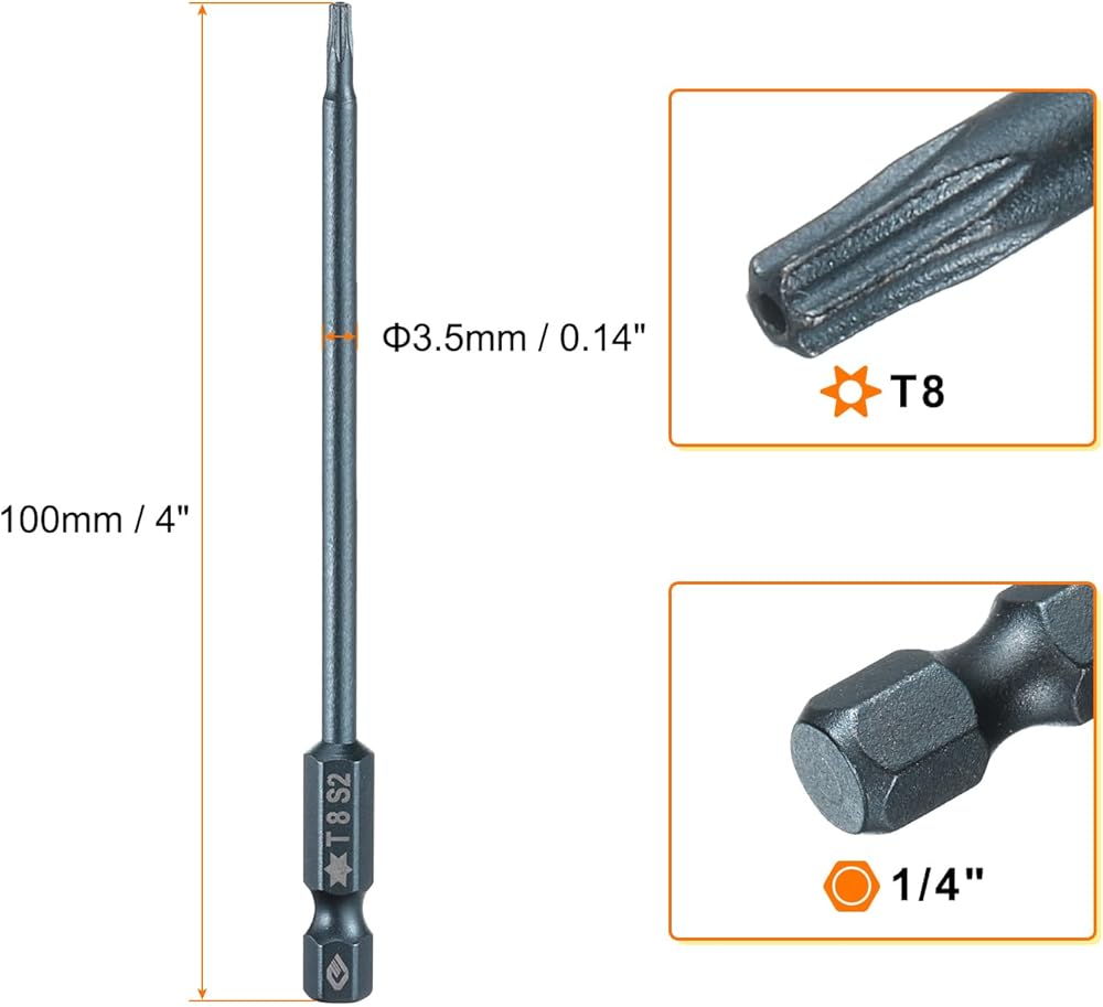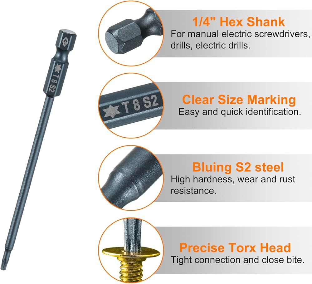 Made of heat-treated S2 steel with a hardness of up to HRC58-62, the torx head screwdriver bit is resistant to bending, breaking, not easy to deform, and durable. The surface is bluing treated to effectively prevent rust and corrosion, ensuring long-term use.