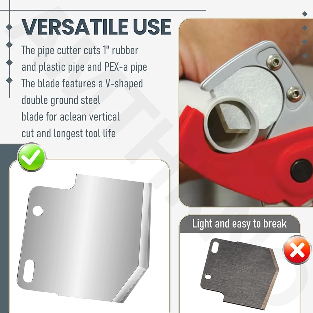 【Versatile Use】: The pipe cutter cuts 1" rubber and plastic pipe and PEX-a pipe. The blade features a V-shaped double ground steel blade for a clean vertical cut and longest tool life