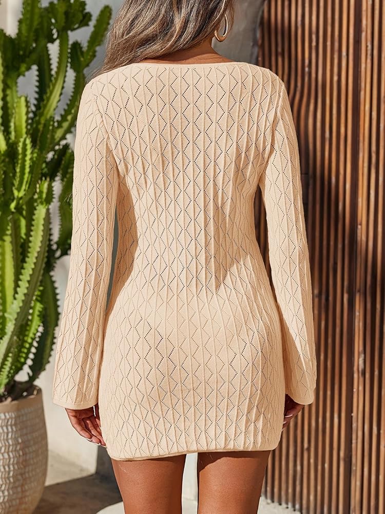 Design: Our long sleeve dress for women features crochet, hollow out,long sleeve, scoop v neck, cute knit buckle on the chest, cut out design, bodycon, slim fit, see through fabric, mini dress, so fashion and chic.