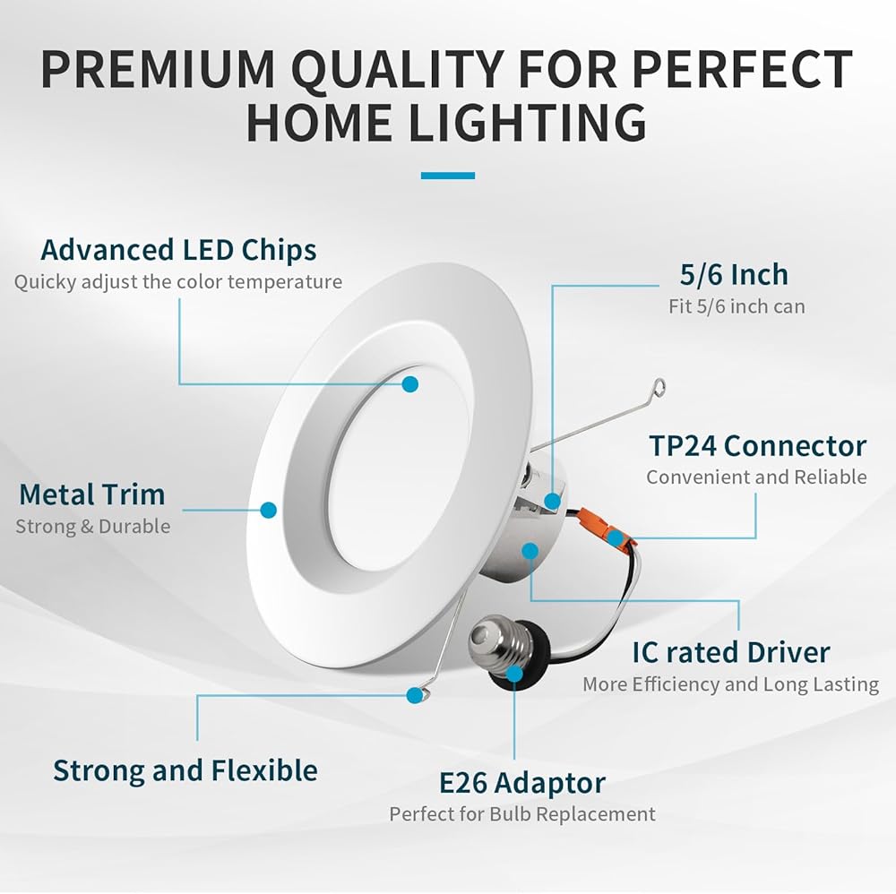 5 SELECTABLE COLORS – Our 6 inch can light is 5CCT adjustable. You can Select color temperature from 2700K warm white, 3000K soft white, 3500K natural white, 4000K cool white, or 5000K daylight for your environment. Don't worry about what color temperature to buy, eliminates the hassle of returning or exchanging these due to inappropriate color temperature.