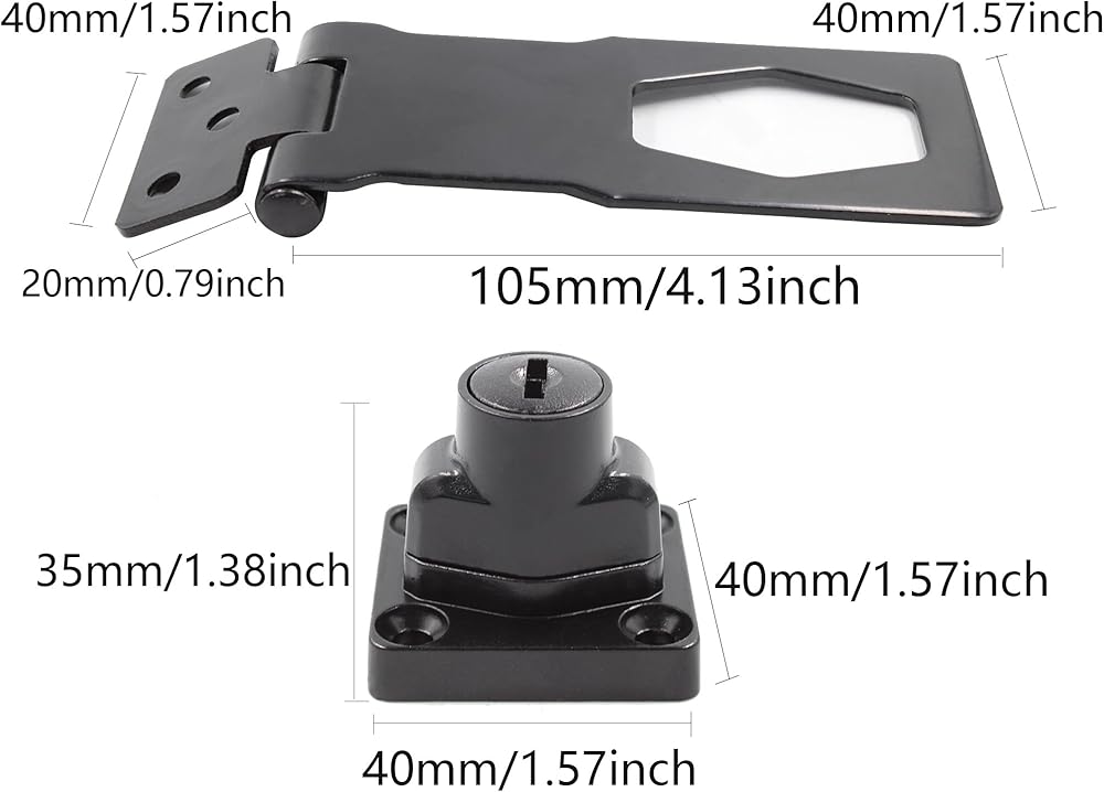 Product Size: The Hasp size of cabinet lock is 4"x1.6" / 101 x 40 mm (L*W). The lock base size is 1.53" x 1.53" x 1.2" / 39 x 39 x 30mm (L*W*H).