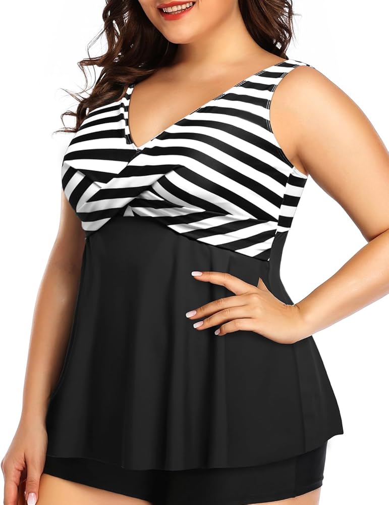 Plus Size Swimsuit Top: The loose fit tankini top features a twist front and flowy design. Its A-line silhouette effectively conceals your belly, creating a slimmer and more stylish look.