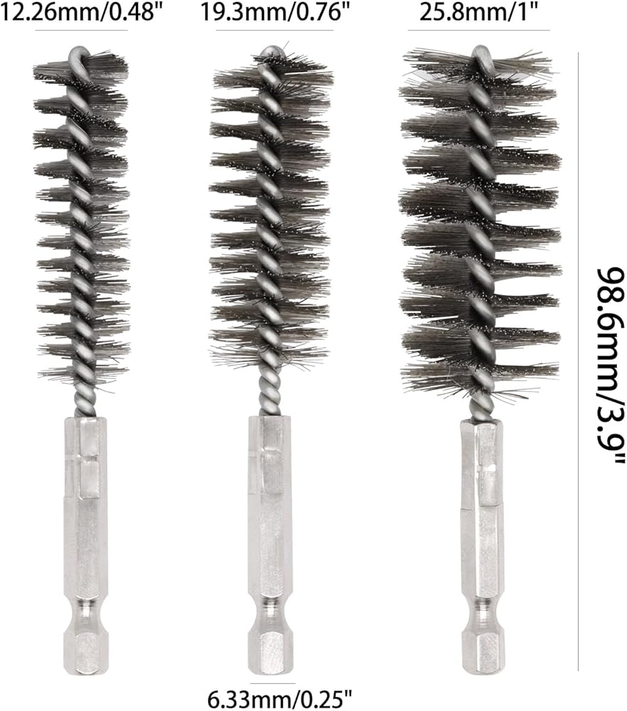 Size: Comes with 6pcs wire brushes for cleaning, includeds 3 diameters: 0.47"/12mm, 0.75"/19mm and 0.98"/25mm, each size 2pcs. Length is 4inch. Various sizes of steel brush for drill will meet your different hole cleaning needs.