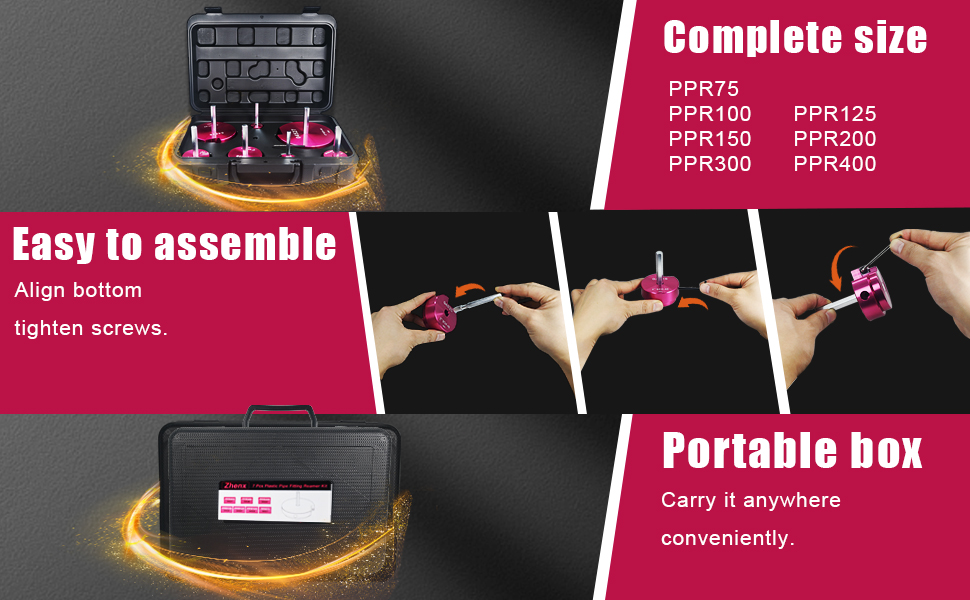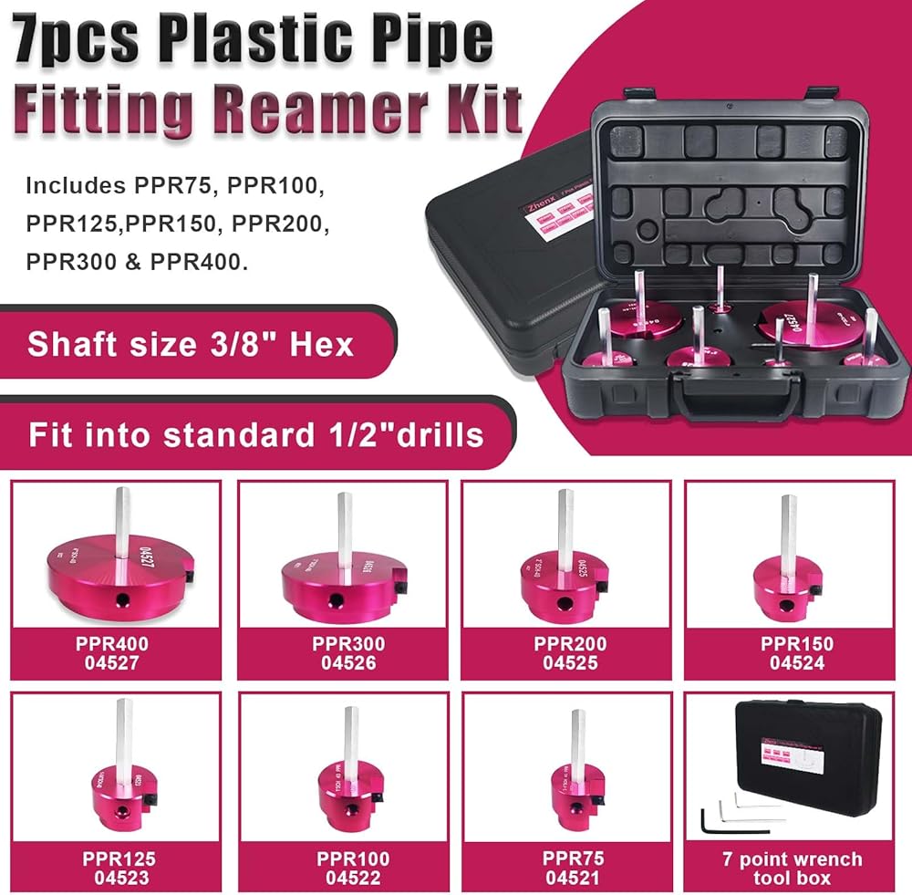 Specifications: 7pcs Plastic Pipe Fitting Reamer Kit includes PPR75, PPR100, PPR125, PPR150, PPR200, PPR300 & PPR400. 3 pc Allen wrench. 1 portable suitcase