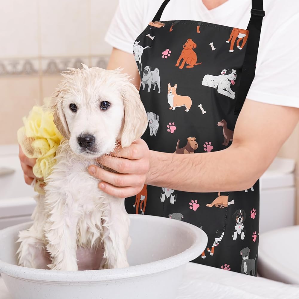 Pet grooming apron for women for dog groomers has adjustable neck straps and extra long back ties. The cute design of pet aprons makes them suitable for both men and women.