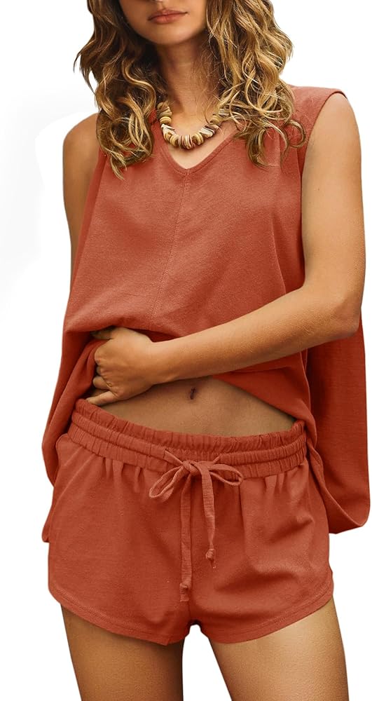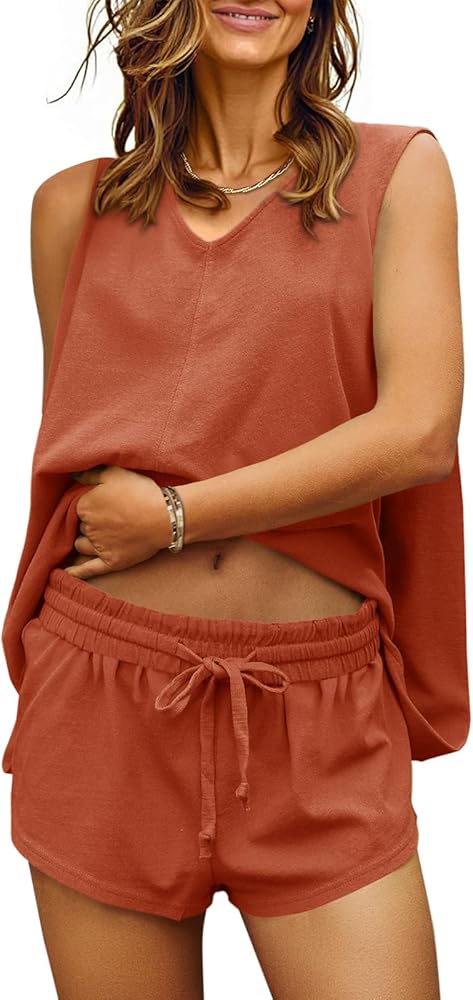 Feature: Short sets features a loose, v neck, exaggerated side folded dropped armholes, solid color, sleeveless t shirts tank tops with elastic drawstring high waisted running shorts; Comfortable, fashionable and chic, relaxed and energetic