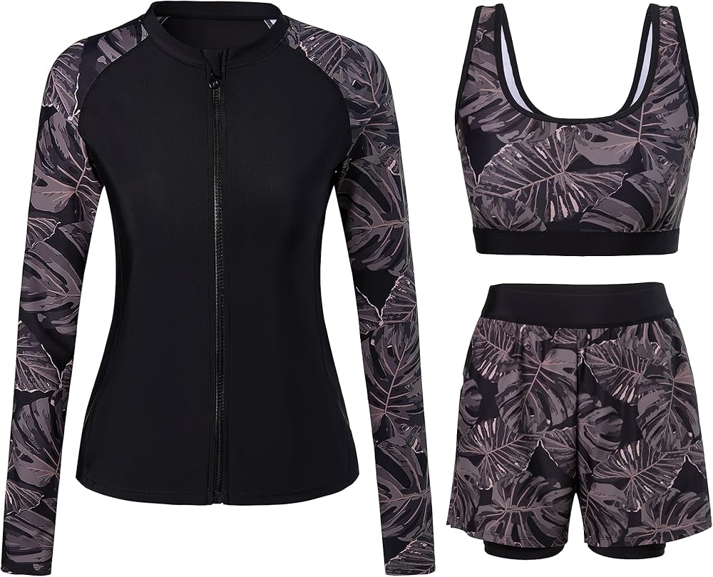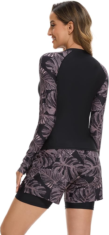 Long Sleeve Rash Guard Sets: The womens rash guard swimsuit includes rash guard shirt, sports bra with removable bust pads and the 2-in-1 two layers high-rise boyshorts bottoms, meeting your water activities needs at once. The high stretchy built-in bra swim shirt offers high support, they don't move around, very comfortable to wear. So you don't need to wear some type of support or bikini top underneath