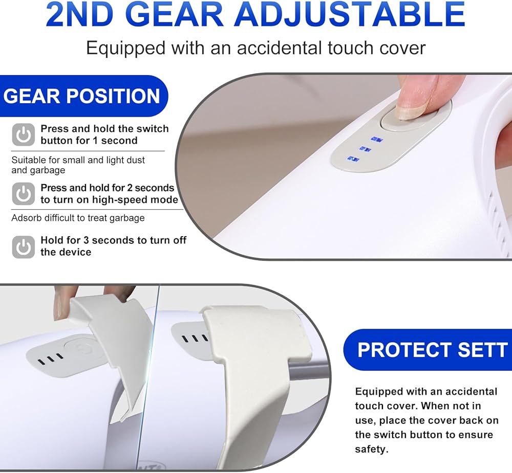 Safe and efficient: This car vacuum cleaner cordless powerful features 2 gear adjustments. Press and hold the switch button for 1 second to turn on the low-speed suction mode, which is suitable for small and light dust and garbage. Long press for 2 seconds to turn on high-speed mode, which can adsorb difficult to handle garbage., Press and hold for 3 seconds to turn off the device. The product is equipped with an anti accidental touch cover. When not in use, place the cover back on the switch button to ensure safety