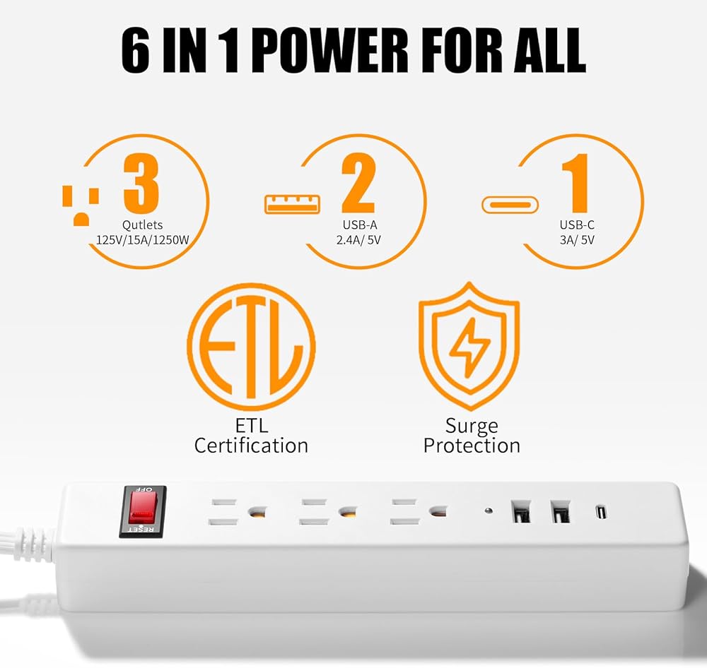 6 Outlets & 6 USB Ports : The 12 in 1 flat double-sided extension cord has 3 Outlets and 3 USB Ports on each side, which could effortlessly charge up to 12 devices at the same time, which is perfect for laptop, lamp, clock, christmas light, phone charger etc.