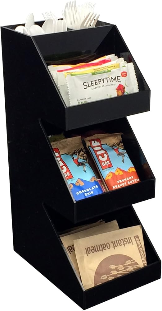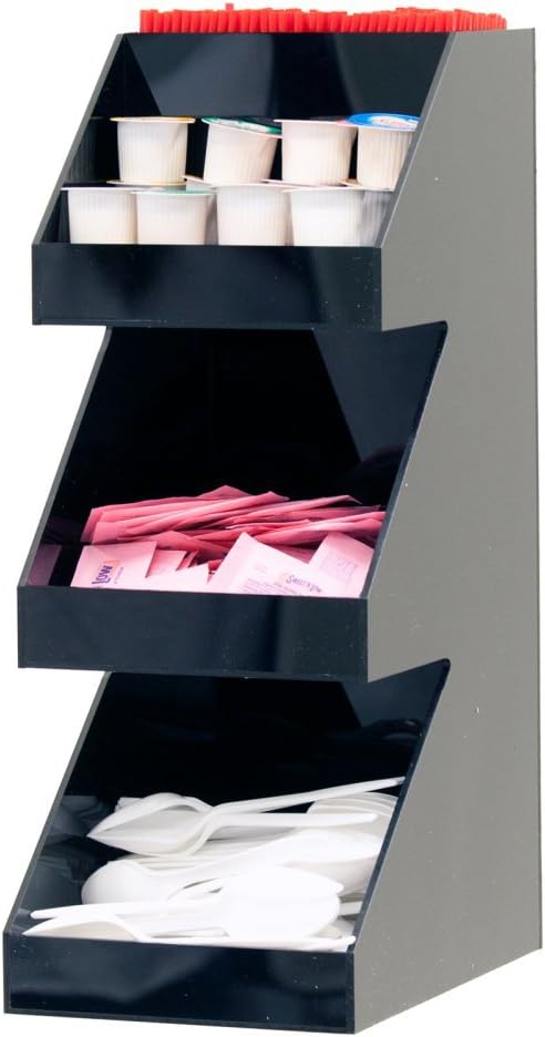 This ultimate beverage station organizer offers a comprehensive solution for any office breakroom or beverage area. It's perfect for creating a centralized spot for employees to gather and enjoy their drinks. The organizer features three vertical tiers, providing five separate compartments for single-serve pods, sugar packets, tea bags, creamers, stirrers, and utensils.