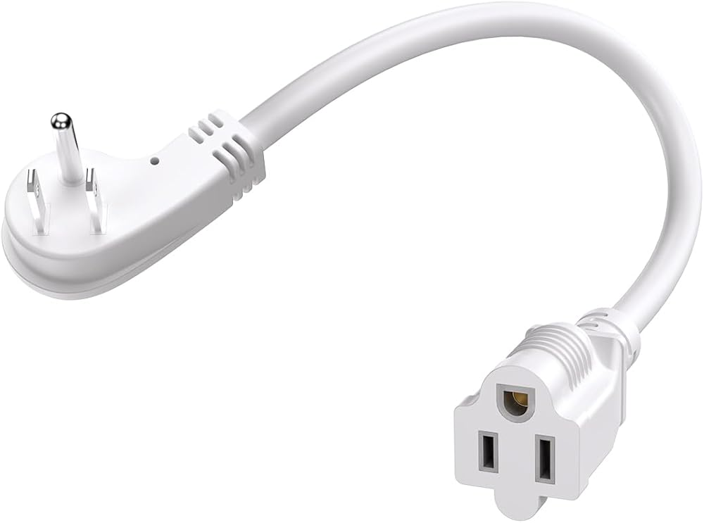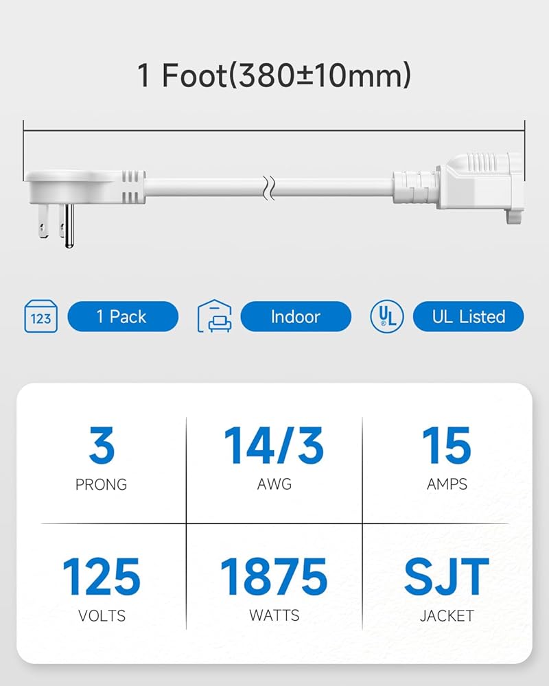 Power Specifications: Connectors: NEMA 5-15P to NEMA 5-15R; Wire Gauge: 3 x 14AWG (offers higher load capacity, suitable for a variety of appliances, including freezer, microwave, air fryer larger ones with higher power demands); Rated for 15A, 125V, 1875W; 3 Pack 1FT White Flat Plug Extension Cord.