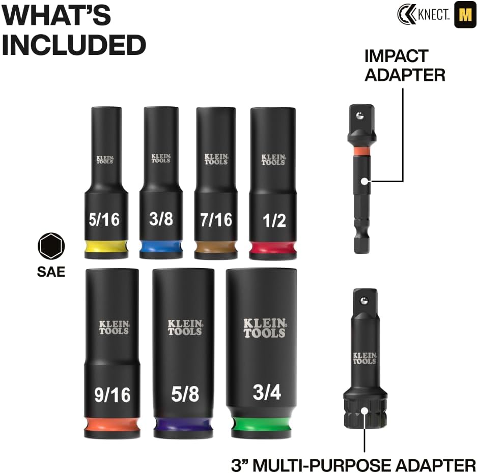 Klein Tools 65109IMPCT KNECT Deep-Well 3/8-Inch Drive Impact Socket Set, SAE, 9-Piece Tool Set with Impact Driver Adapter, Multi-Purpose Wrench Adapter, Color-Coded, MODbox Socket Organizer