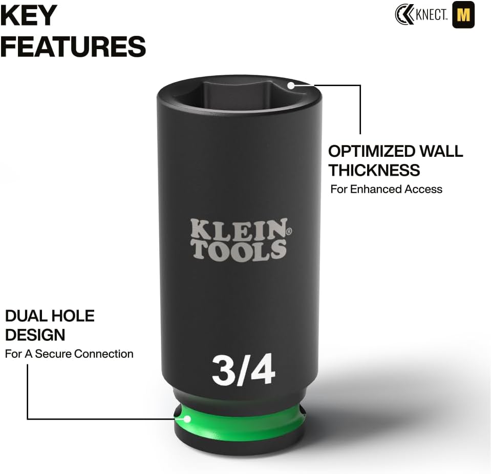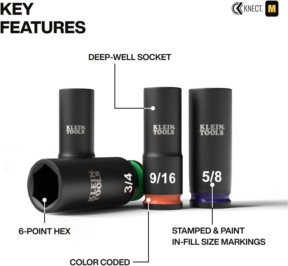 This 14-Piece impact socket set features color-coded sockets in sizes 3/8, 7/16, 1/2, 9/16, 5/8, 11/16, 3/4, 13/16, 7/8, 15/16 and 1-Inch. Each impact socket provides increased reach and additional depth for longer bolts. Also comes in a compact, modular storage system that is compatible with MODbox and stackable with other cases of similar design. For more than 160 years, Klein Tools has manufactured premium-quality, professional-grade hand tools that deliver the performance, durability and precision needed to get the job done right. Our family of engineers, workers and craftsman continue to put six generations of expertise into every tool we create by using only the highest quality materials, superior workmanship, and keeping manufacturing as close to home as we can. Klein isn't just the name of our company, it's also our family name. And since we're an American company that's family-owned and family-run, you know you can count on us to be here tomorrow. Klein Tools doesn't just make great products, we make great products that stand up to the demands of the professionals who use them every day ... Since 1857.