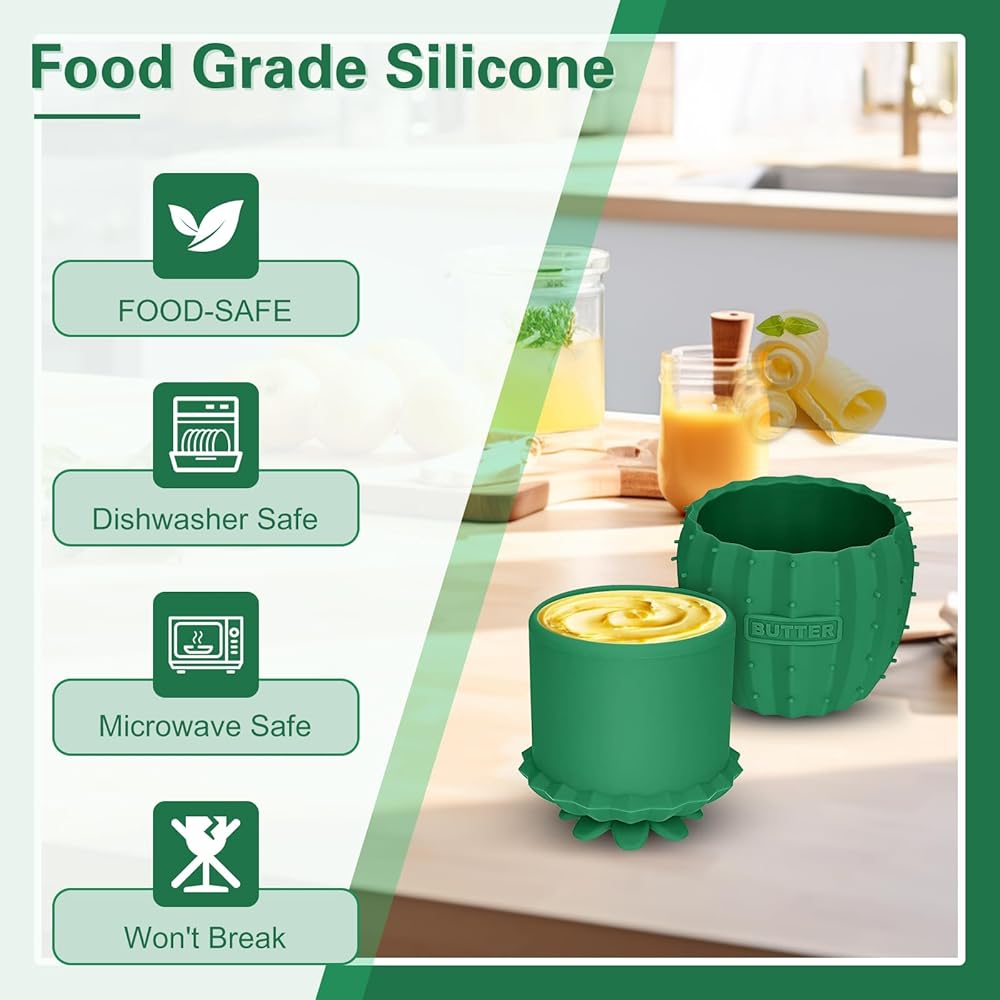 Silicone French Butter Crock with Lid,8.4oz/238ml Cactus Spreadable Butter Keeper with Water Line to Leave On Counter,Cute Creative Butter Storage Container for Countertop-Deep Green