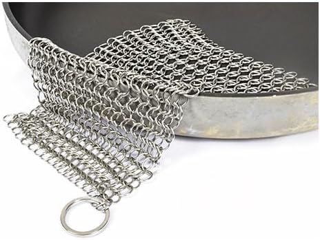 Designed to tackle the toughest cleaning jobs, the chain scrubber for cast iron efficiently removes stubborn baked-on food, rust, and residue from your cast iron pans metal scrubber for cast iron skillets, and pots. Its unique chainmail construction gently scours surfaces without causing damage, ensuring your cookware retains its naturally non-stick seasoning. This scrubber is also ideal for cleaning dishes and glassware, leaving them sparkling clean.