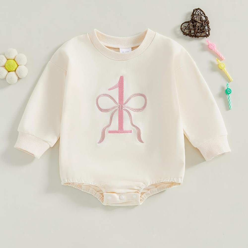 Size: Fit for 6-12 months, 12-18 months baby girl. Baby girl birthday outfit 1 year old, fall long sleeve romper, baby girl bubble sweatshirt bodysuit