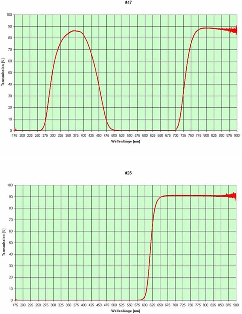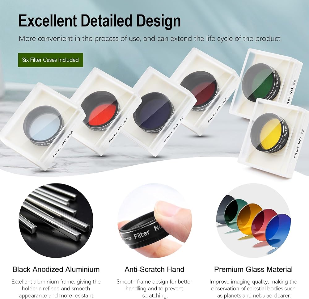 #23A Light Red- The red filters are made from renowned Schott and Hoya optical glass and allow for maximum contrast on viewing planetary and lunar detail; #12 Yellow - The yellow filter improves contrast on Moon craters; on Mars; channels and polar caps become more apparent