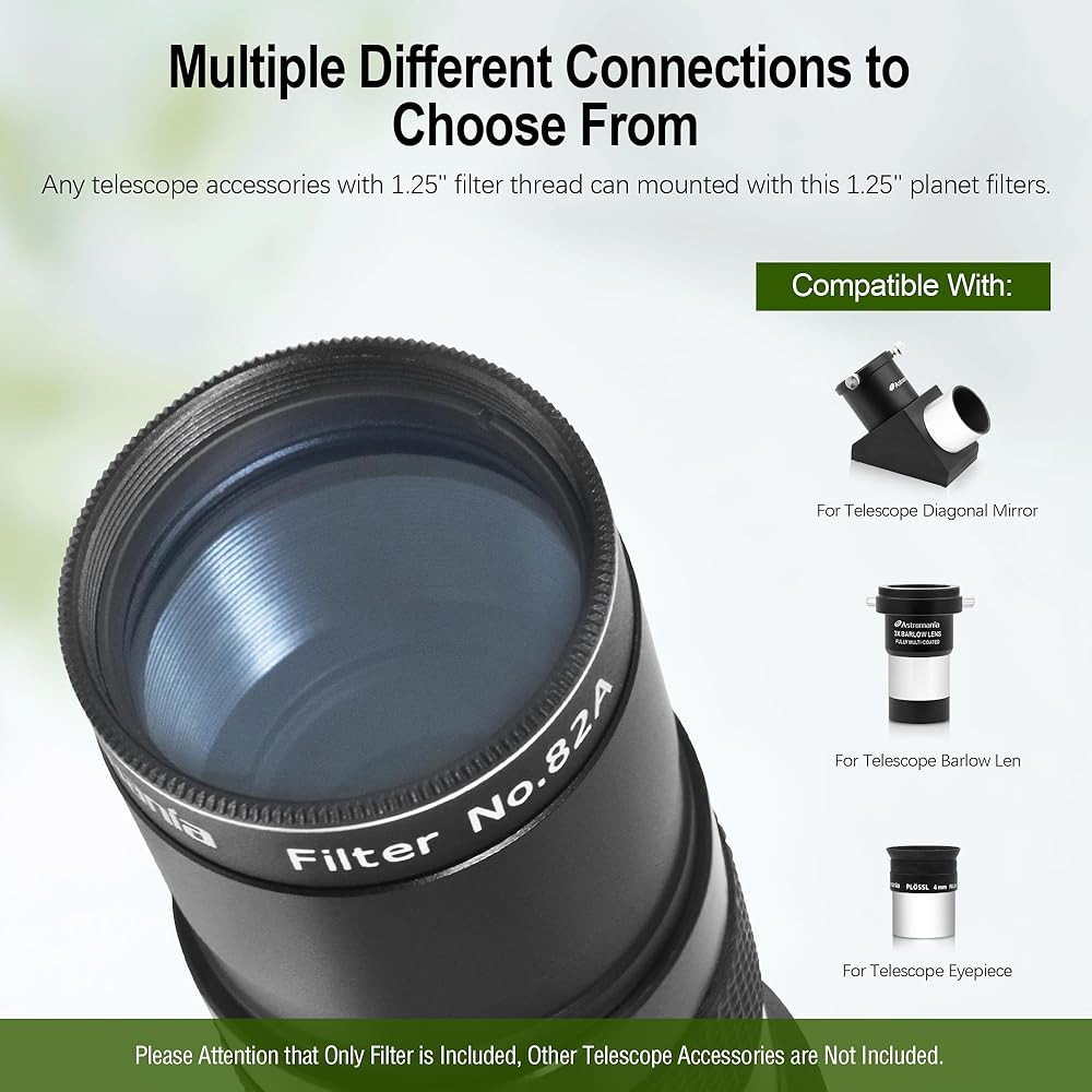 #80A Blue - The blue filter is suitable for Moon; Mars; Jupiter and Saturne observation; it improves contrast on faint areas without affecting the planet's brightness; which is why this filter is often used in combination with others