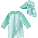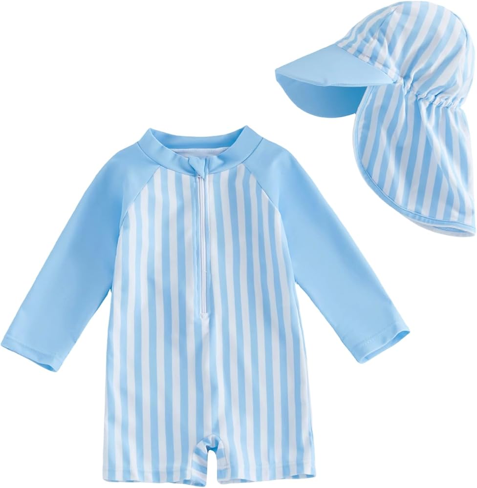 Baby boy rash guard swimsuit; Girls rash guard swimsuit, classic plaid print, adding a fashionable touch; Short sleeves and round neck, front zipper closure, easy to put on and take off; And hat set, perfect for summer wearing