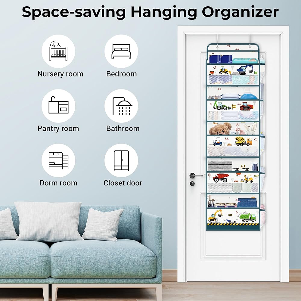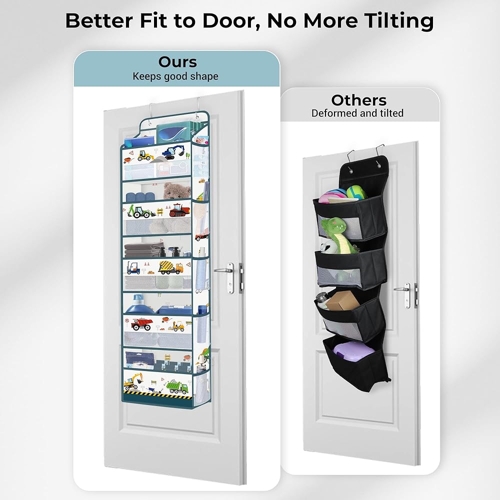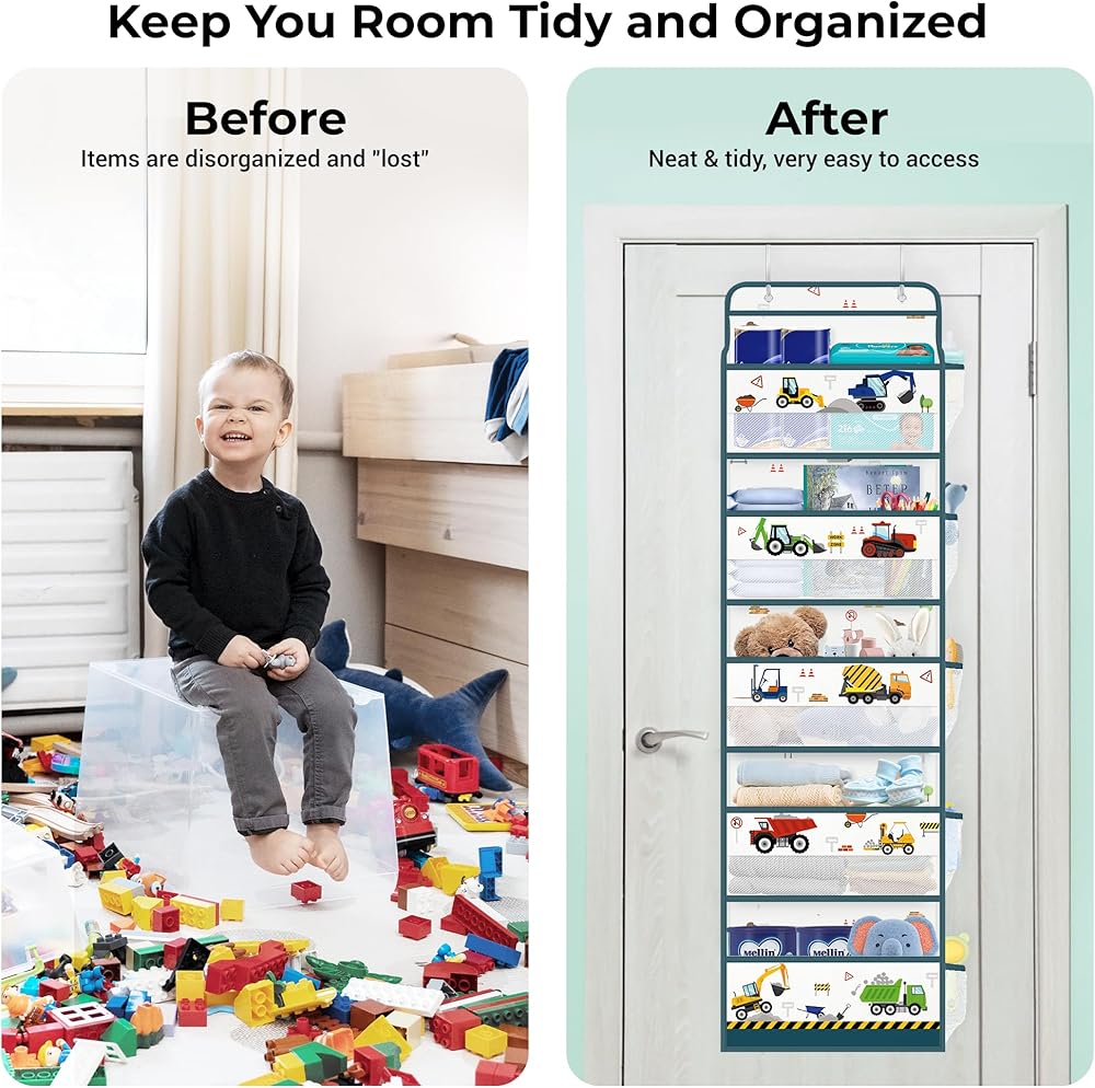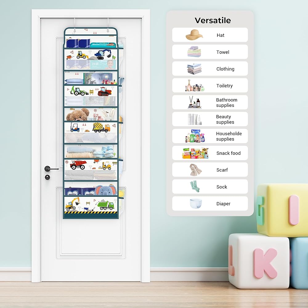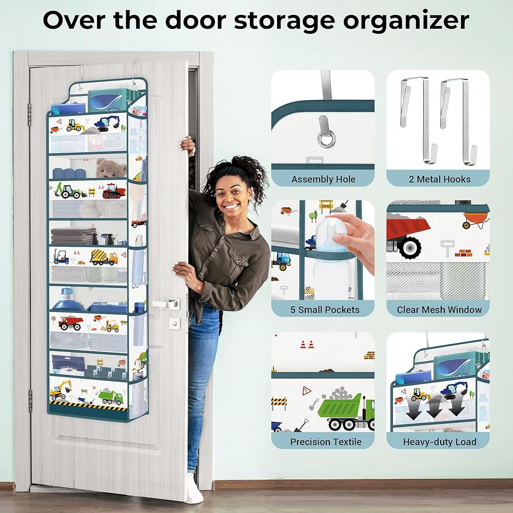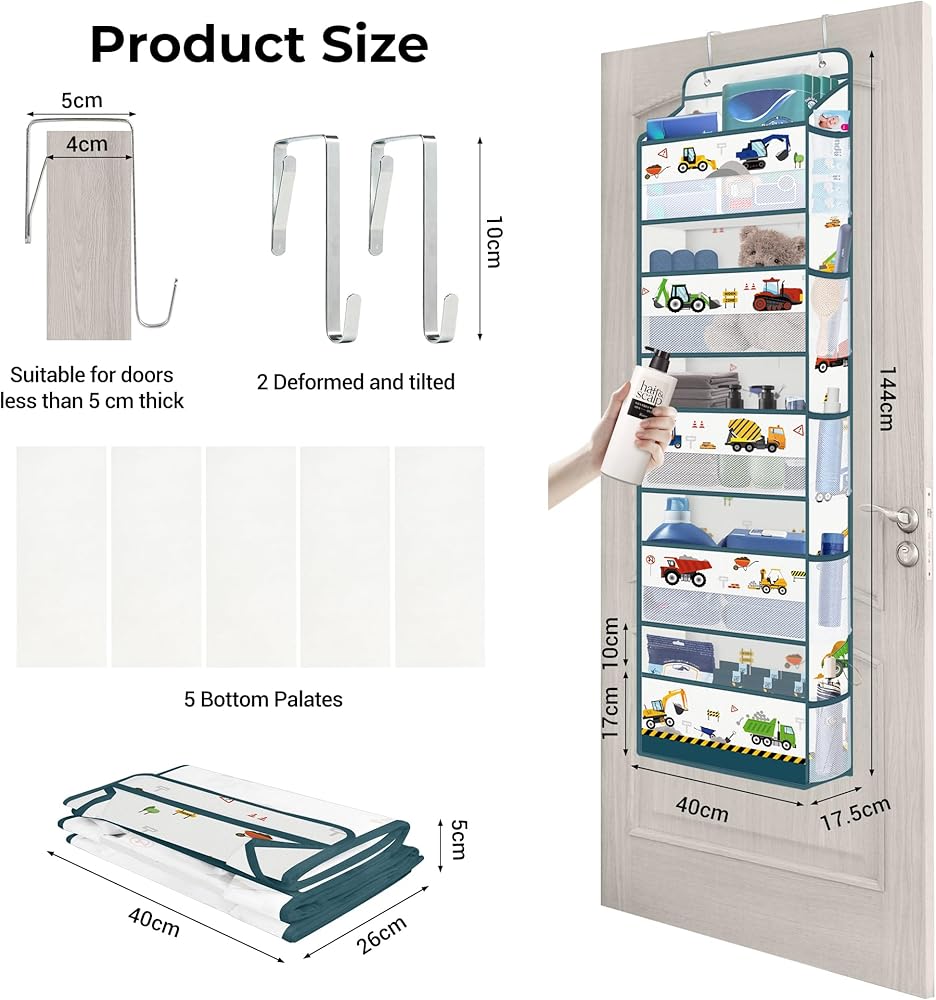 Enhanced Storage Space--- The door hanging storage maximise your under-utilised space behind the door for bedroom/bathroom/nursery room/caravans and so on. Design with construction vehicle, make it more interesting