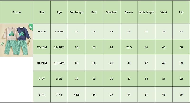 3-4Y Tops Length: 16.73 Bust: 25.98 Pants Length: 21.65 Waist: 18.11 Advised Age: 3-4 Years