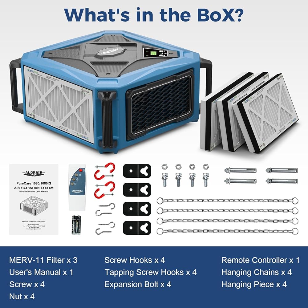 Accessibility: Timer cycle controller, you can set fan to shut down automatically in 1-9 hours. √ IR remote system: There is no wireless interference, and the anti-interference ability is strong. √ With a hook and chain: Puricare 1080IG air filtration system is easy to move and can be hung from the ceiling in the shop or placed on a workbench.