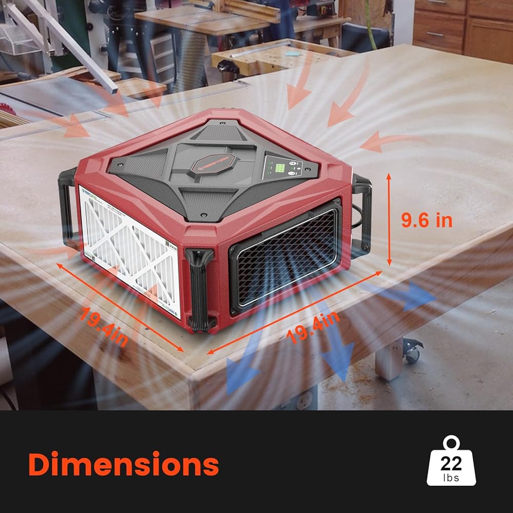Compact and Portable: This shop dust collector features sturdy handles on all four corners with an anti-slip design for easy handling. Weighing just 22 lbs, its portable design allows you to move the air filtration system effortlessly, providing flexibility and convenience for any workspace
