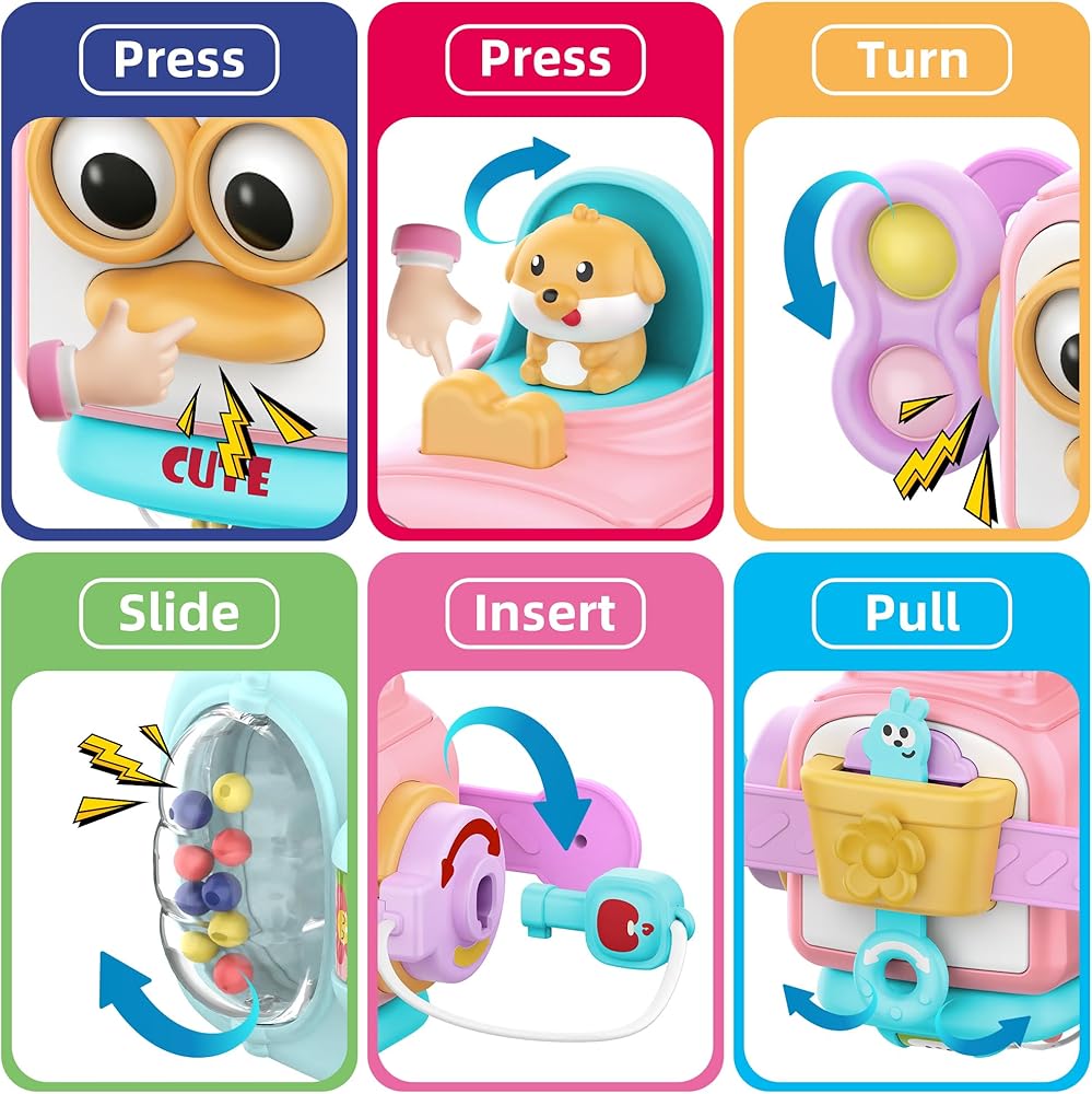 【Montessori Busy Toys】SOONYANG montessori toys features a variety of activities such as simulated faucet rotation, simulated buckle, pressable buttons, a pop-up toy, key switch plug, a fidget spinner, popping bubbles, as well as a baby rattle. As a baby toy to explore and try, it awakens the curiosity of the children, helps them explore, experiment and discover.Little one will get busy and entertained for hours.