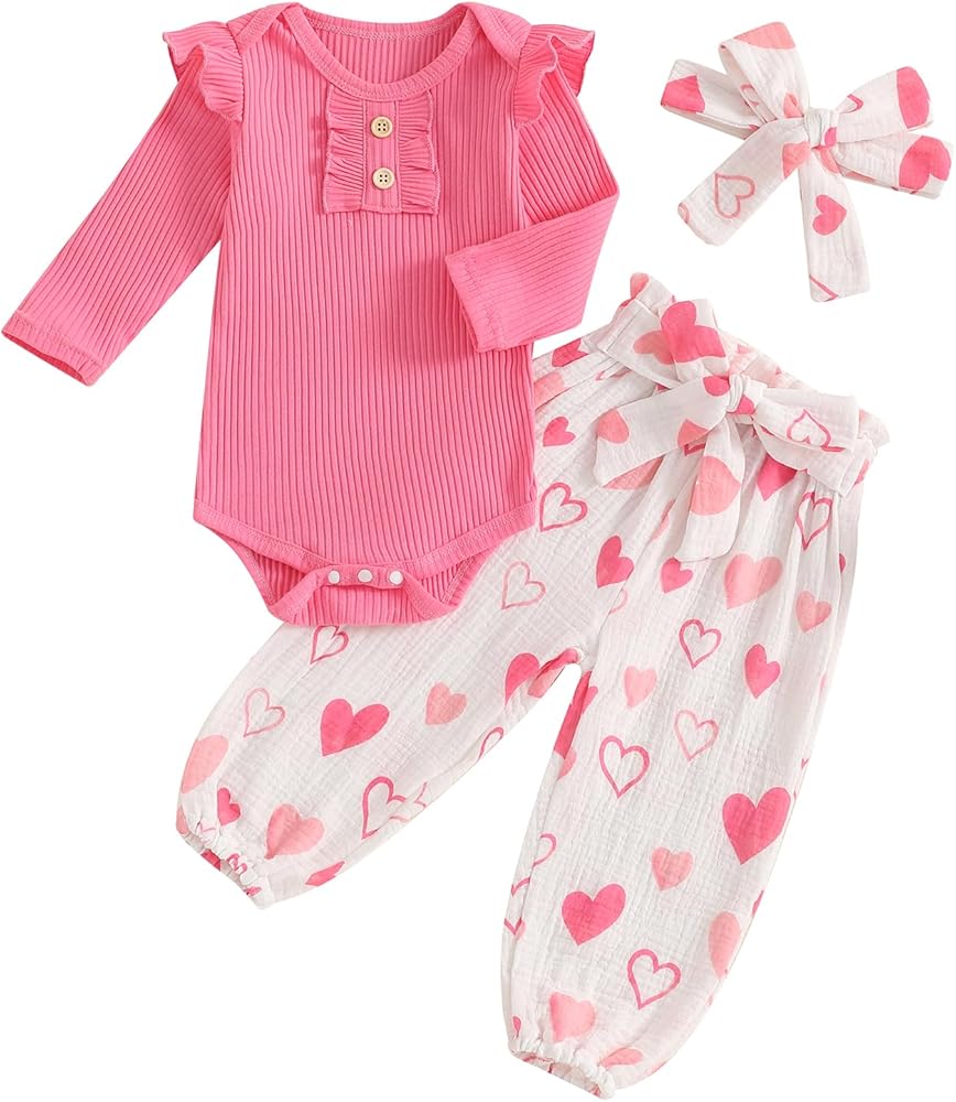 Newborn Baby Girl Valentine's Day Outfit Long Sleeve Ribbed Romper Heart Print Pants Headband 3Pcs Set