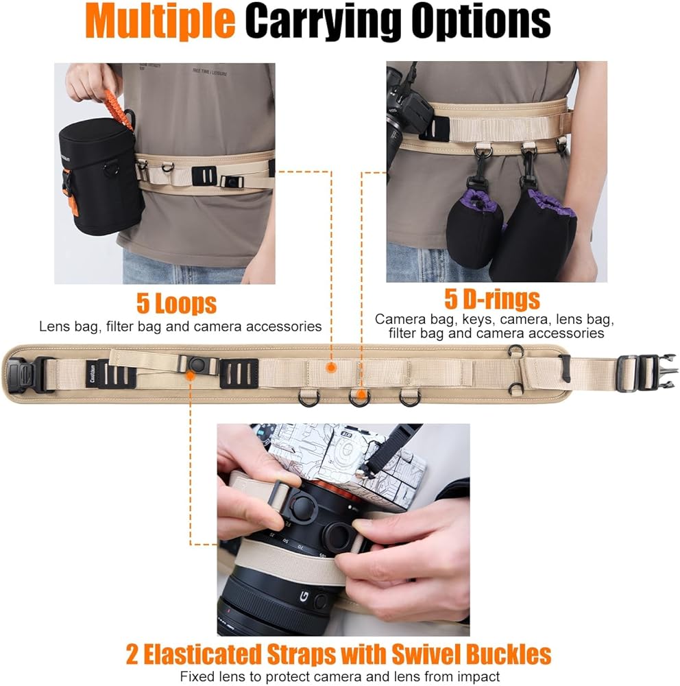 【Multi-Functional】: Camera Waist Strap with 5 x D-ring rings and 5x pant loops design which can hold camera bag, camera, lens bag, filter bag and camera accessories. Two elasticated straps with swivel buckles provide two ways to secure your lens, protecting your camera and lens from bumps. Double safety buckle design, the lock won't slip off when you press the button coincidently.