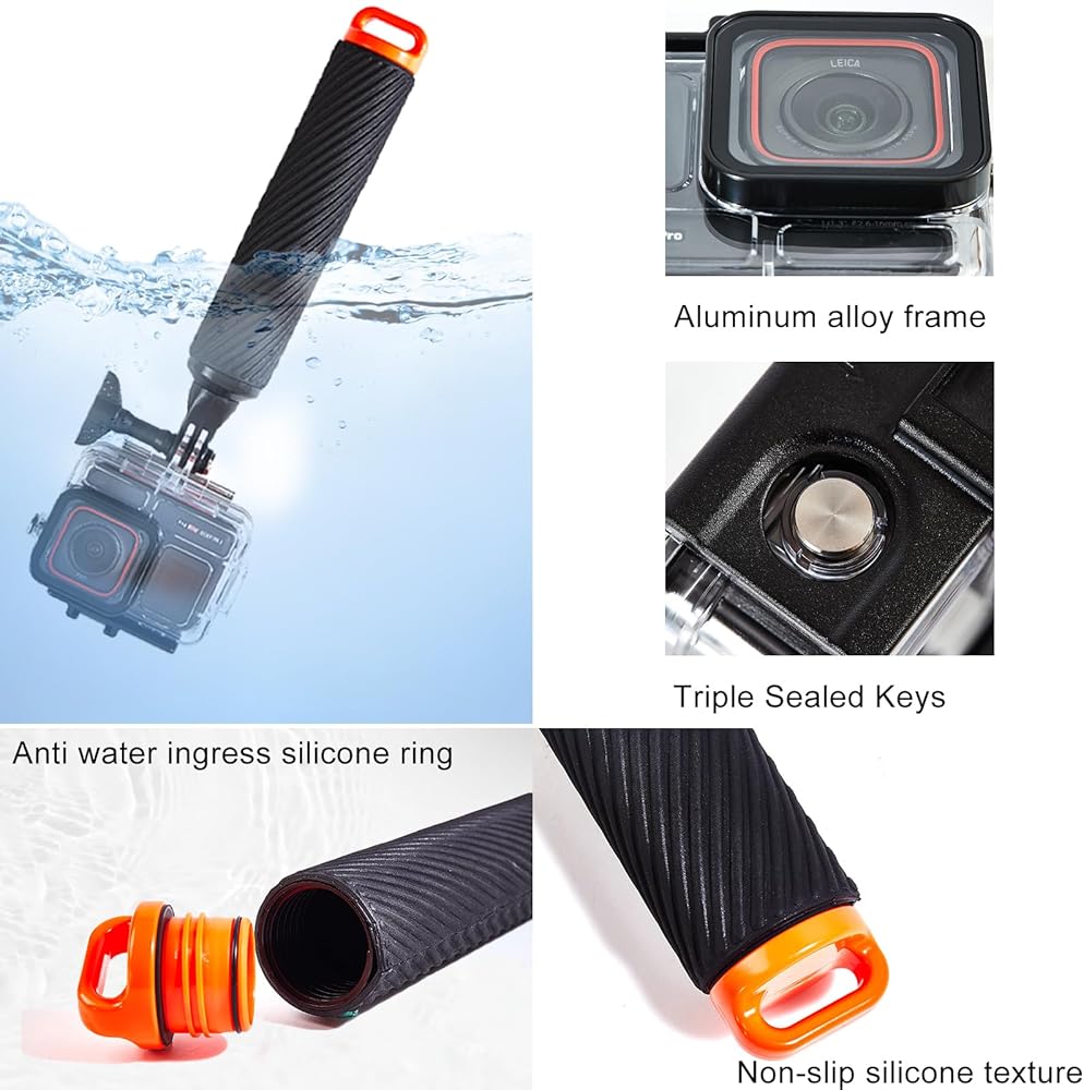 【Floating Handle】The design of this floating handle ensures that your camera always floats on the surface of the water, even if you accidentally let go of it, preventing the camera from sinking and providing extra security. The handle is made of a comfortable material that provides a firm grip, making it easier for you to shoot underwater landscapes and enjoy the fun of shooting on the water while keeping your equipment safe.