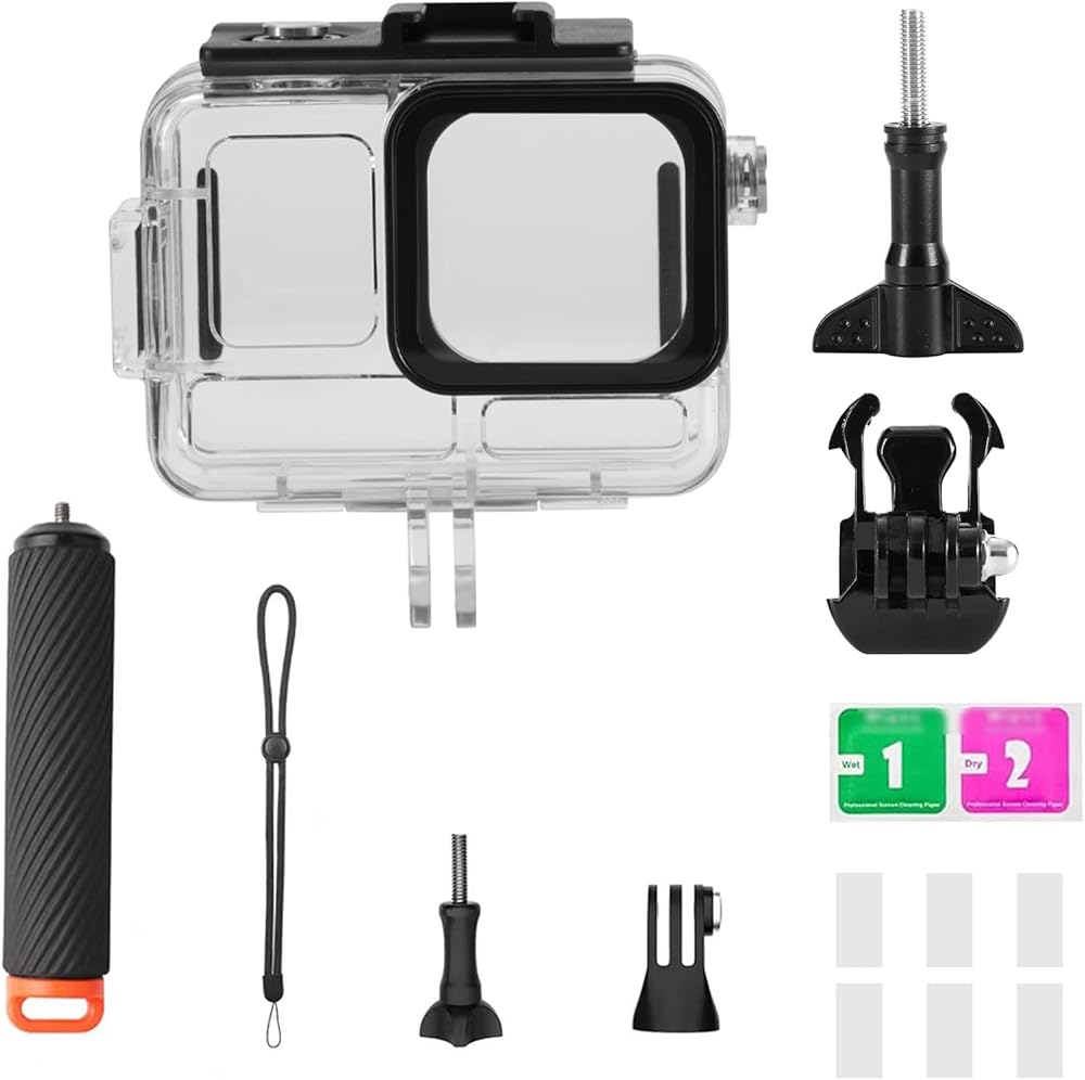【All-around Protection for Your Camera】This dive kit provides all-around protection and functionality for your action camera, including a waterproof housing, 3 pack dive filters, floating handle and 6 pieces anti-fogging insert. Whether it's for water sports or underwater adventures, it effectively secures your camera and makes it easy to capture every moment during diving, surfing, swimming and other activities