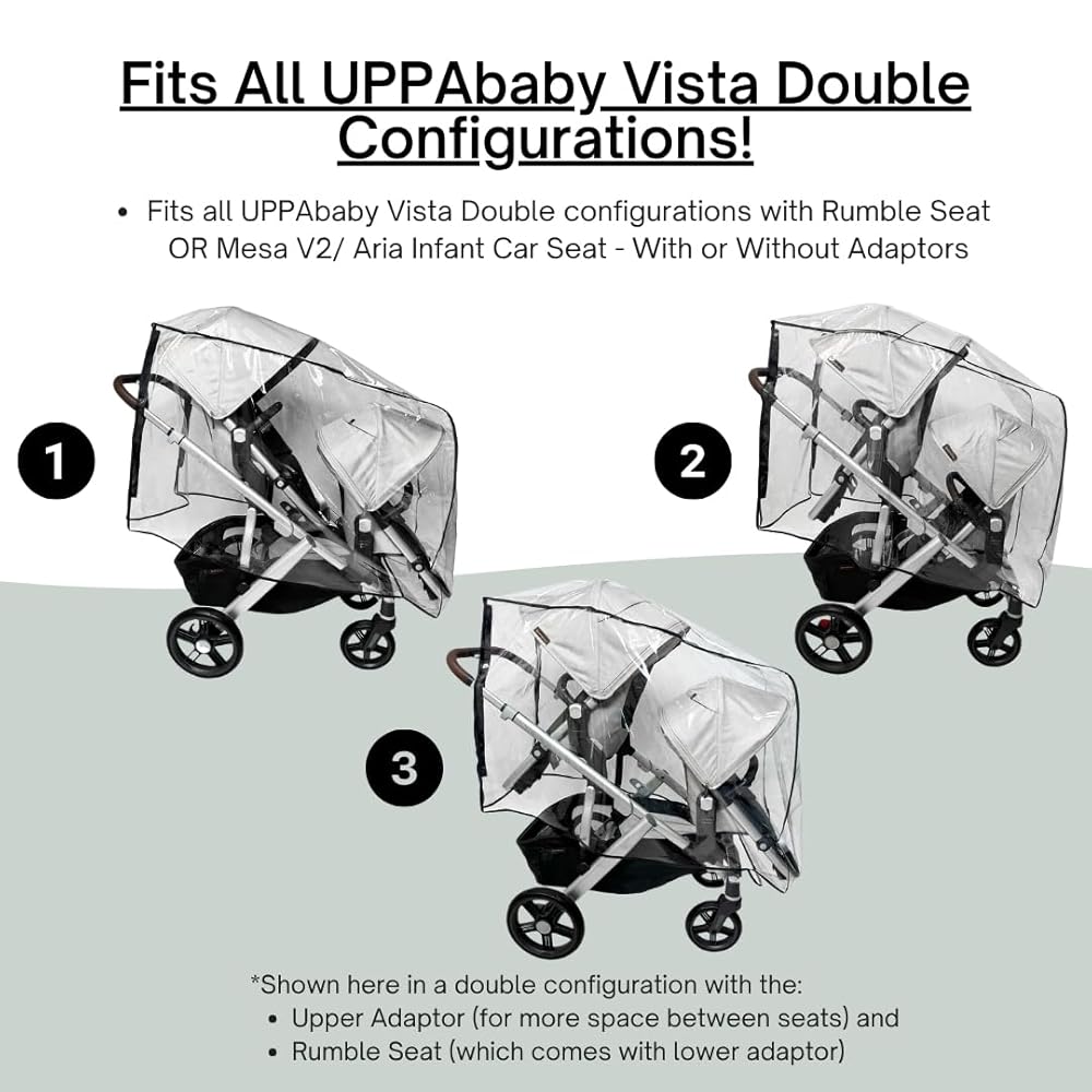 SASHA'S Rain and Wind Cover is custom MADE for the UPPAbaby Vista V2, V3 Double Stroller System w/ RumbleSeat V2, V3 ,providing maximum coverage to protect children from the elements. This stroller cover is perfect for travel, ensuring your little one stays dry and shielded from rain, wind, debris, and flying insects. Its clear design allows parents to keep an eye on their child at all times, while ventilation holes ensure proper airflow. With its durable construction and precise fit, this rain and wind cover is an essential accessory MADE for the UPPAbaby Vista V2, V3 Double Stroller System w/ RumbleSeat V2, V3 , keeping your child comfortable and safe during outdoor adventures. Stay prepared for any weather condition with this practical and reliable stroller cover.