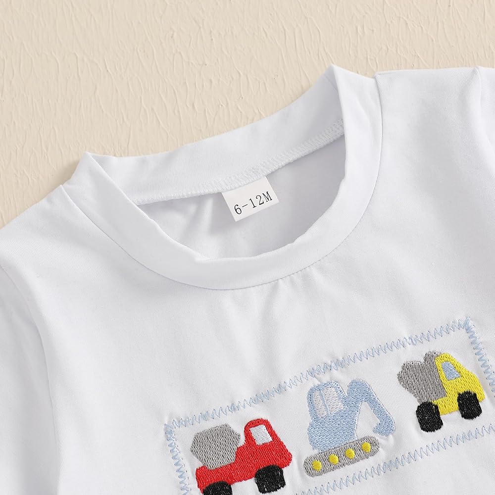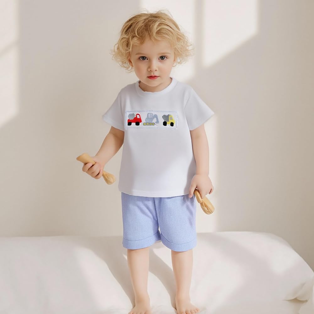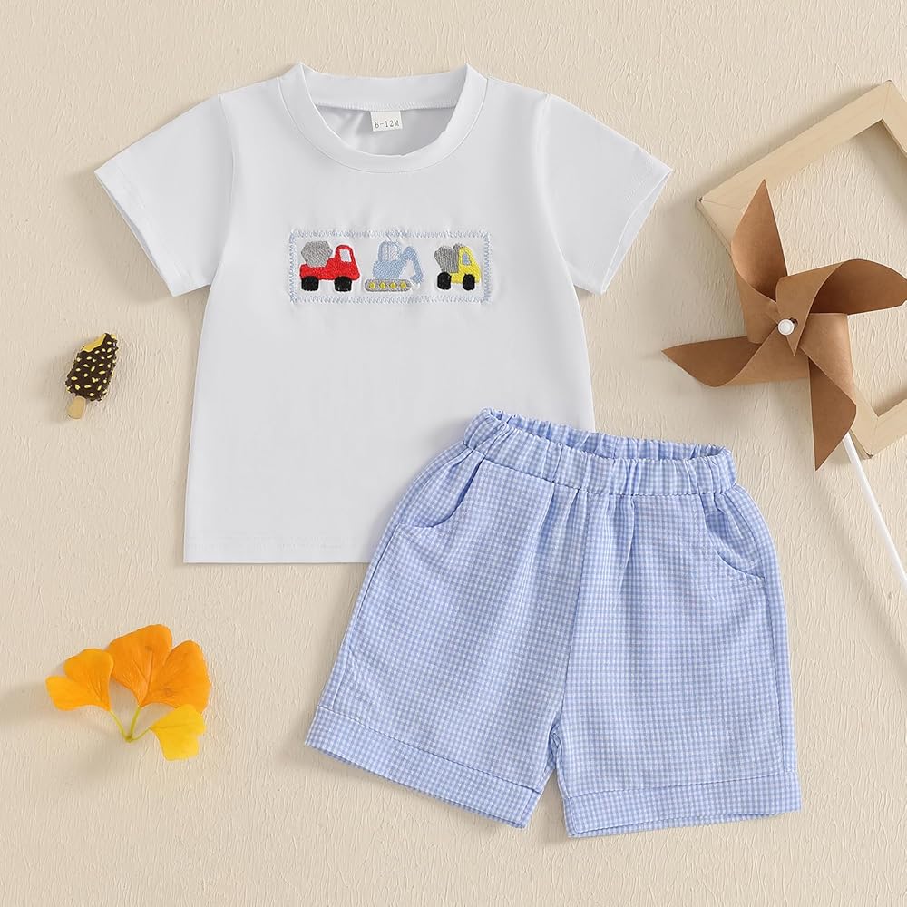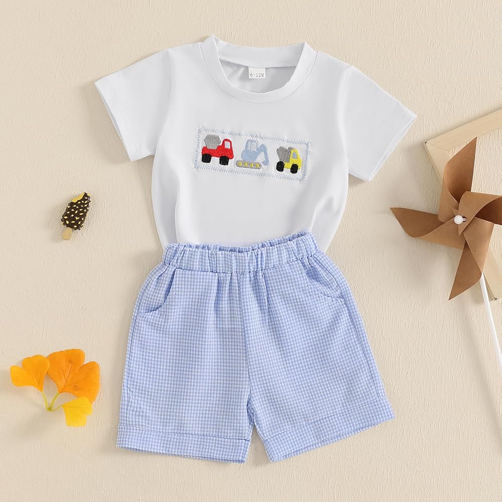 Design: Baby boy summer outfit with chic and classic style; Cozy fabric to ensure your little one cool all-day-long; The baby boy set can be worn as a playwear or beach wear feature: Little boy's clothes, baby boy cloths; Loose fit; Tops with short sleeve, round neck, fire truck embroidery; Shorts with elastic waistband, plaid print, side pockets