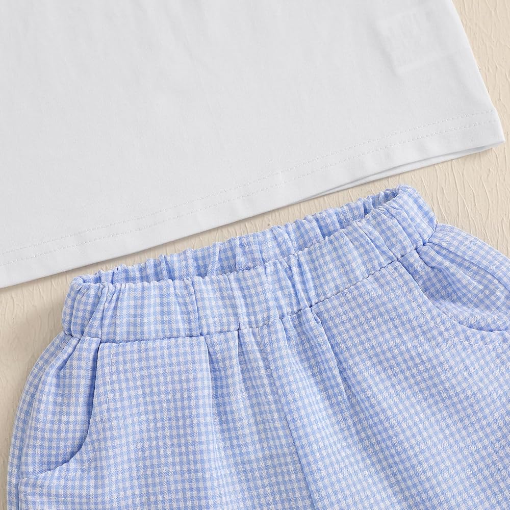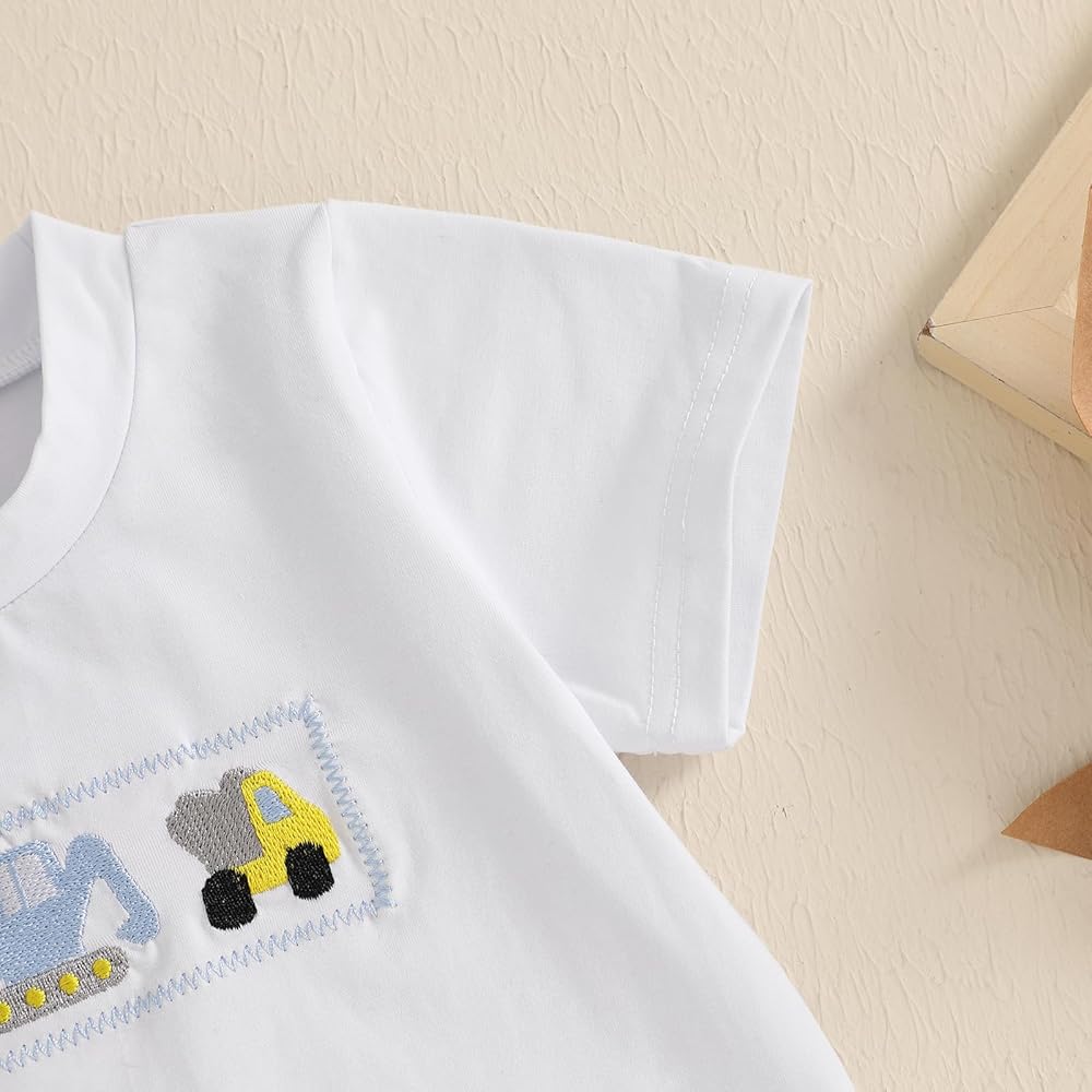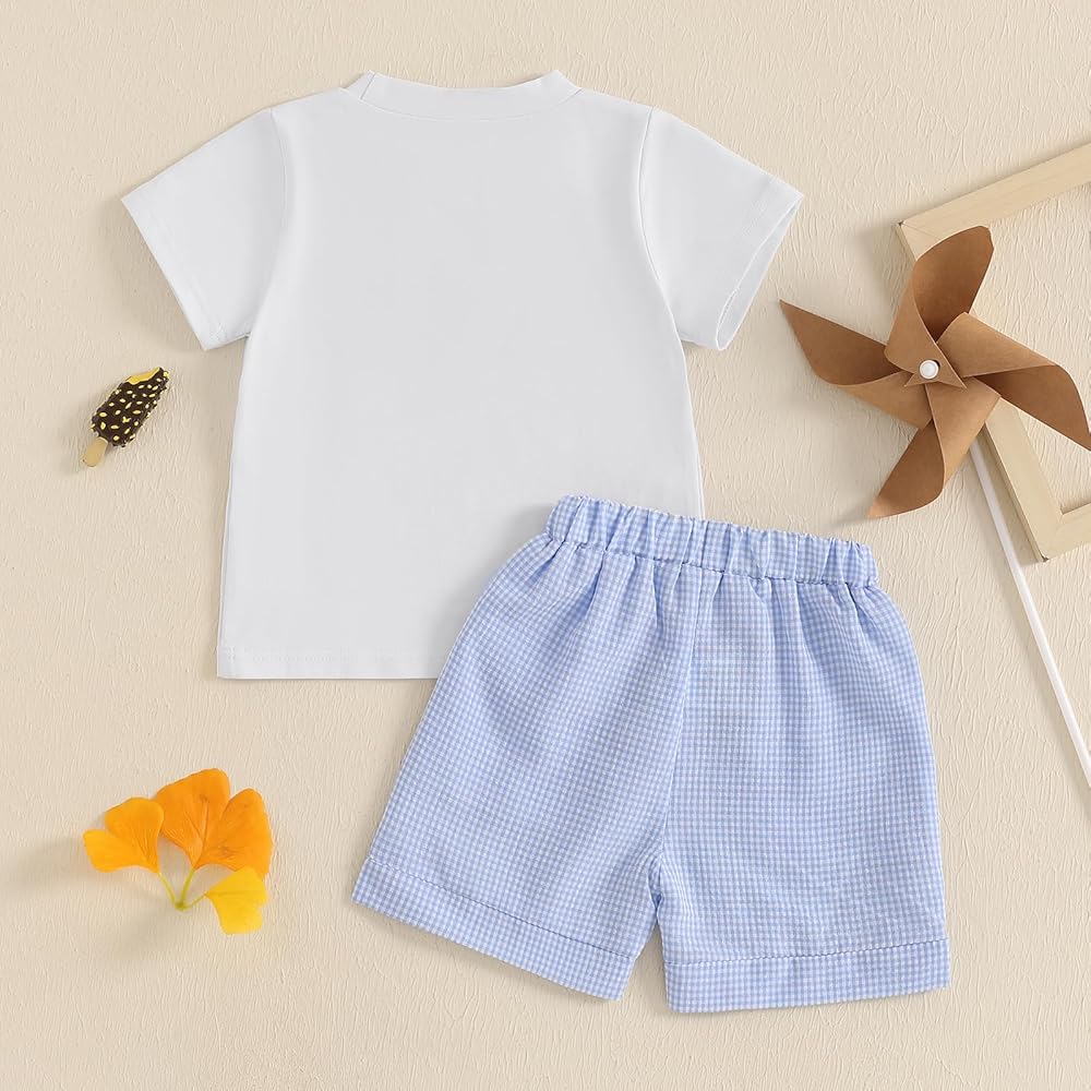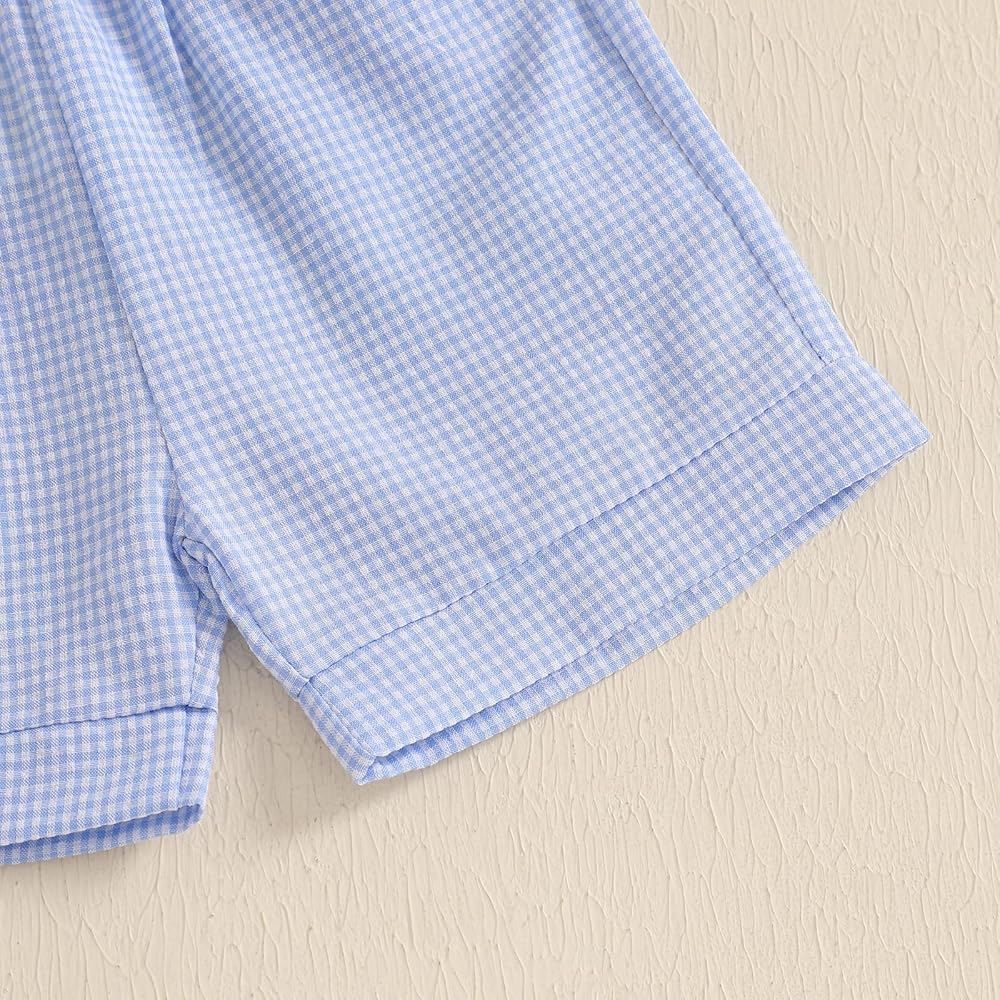 Design: Baby boy summer outfit with chic and classic style; Cozy fabric to ensure your little one cool all-day-long; The baby boy set can be worn as a playwear or beach wear feature: Little boy's clothes, baby boy cloths; Loose fit; Tops with short sleeve, round neck, fire truck embroidery; Shorts with elastic waistband, plaid print, side pockets